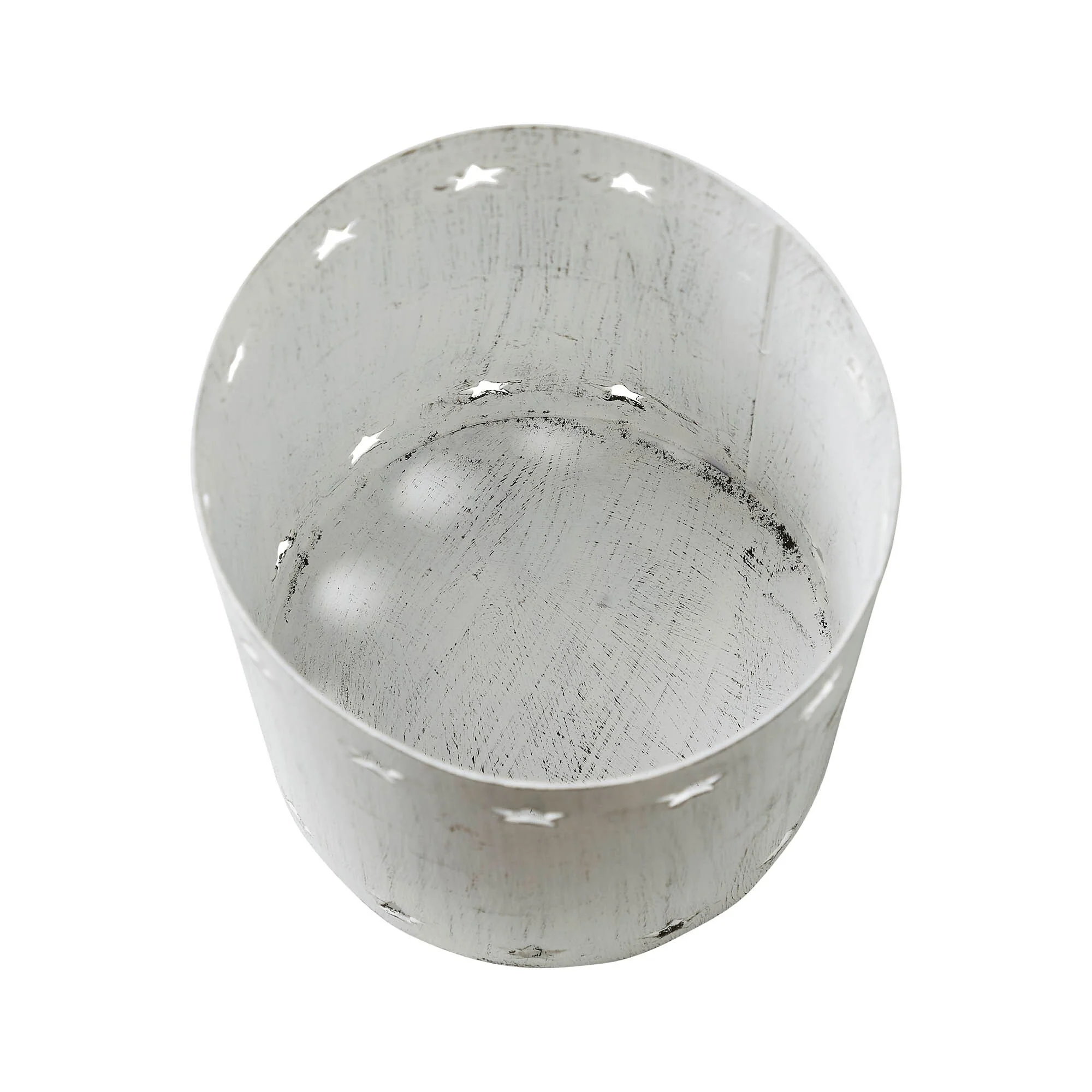 Elevate your home decor with the charming allure of the VHC Brands Metal Votive Candle Holder. Crafted from durable metal, this candle holder boasts a rustic design featuring cutout stars that add a touch of whimsy and warmth to any space. Measuring 6x4.25x4.25 inches, it's perfectly sized for adorning kitchen dining tables, shelves, or mantels, creating a cozy ambiance for gatherings or quiet evenings at home.The white hue and primitive rustic style of this candle holder make it a versatile accent piece that complements various decor themes, from farmhouse to country-inspired interiors. Its distressed appearance adds a vintage appeal, infusing your living spaces with character and charm. Whether placed in the dining room, entryway, or living room, this candle holder brings an inviting glow to your home decor, creating a welcoming atmosphere for family and guests alike. While enjoying the ambiance created by this candle holder, it's essential to prioritize safety. Avoid touching or moving the holder while warm or when a candle is lit to prevent accidents. Always allow the holder to cool down before handling, and keep it out of reach of children. Additionally, exercise caution by refraining from placing a lit candle near flammable objects, ensuring a secure and tranquil environment in your rustic-themed living spaces.