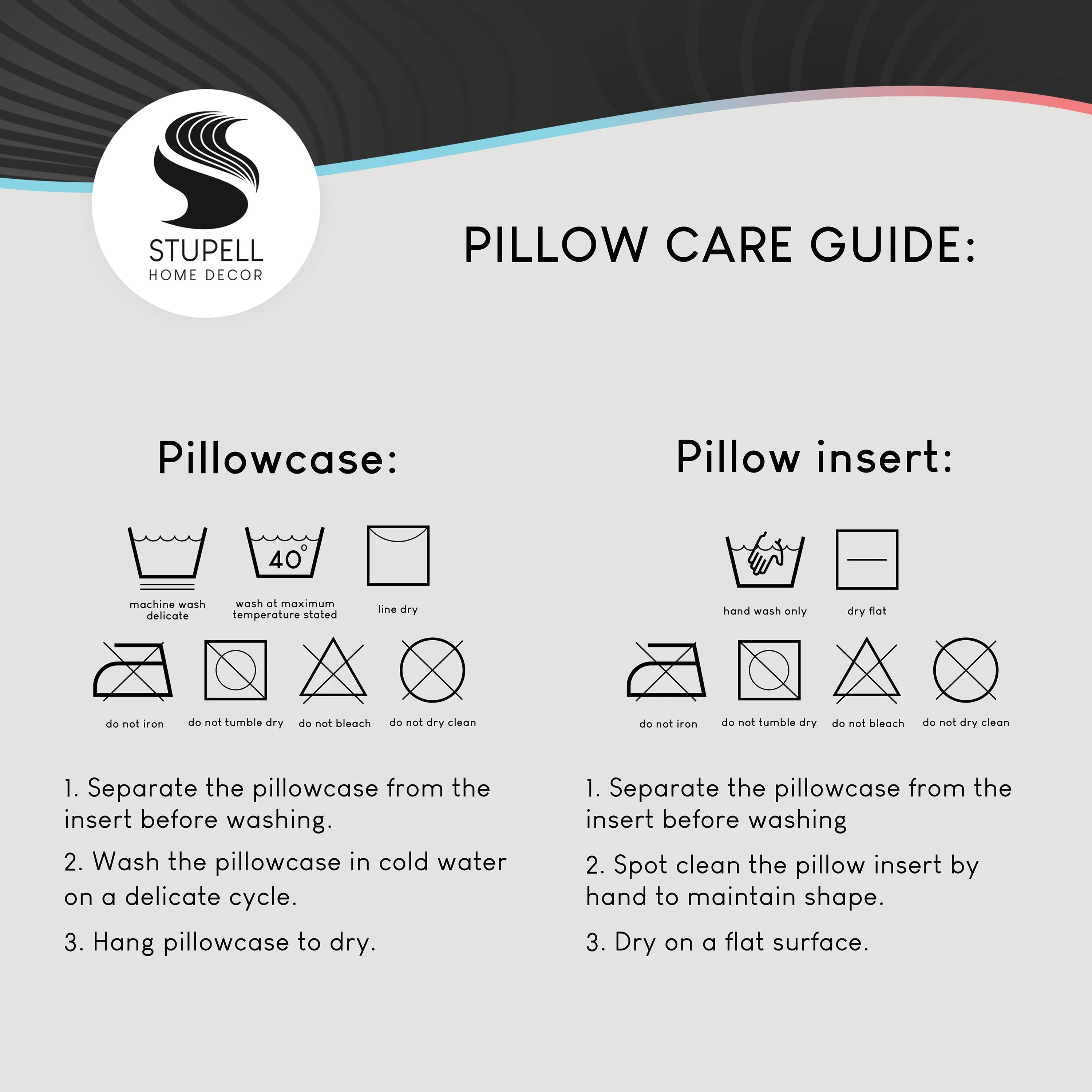 - To wash remove filling insert from casing using invisible zipper. Clean pillow case separately, machine wash on delicate with cold water and mild detergent. For best quality hang dry. Pillow insert is spot clean only.