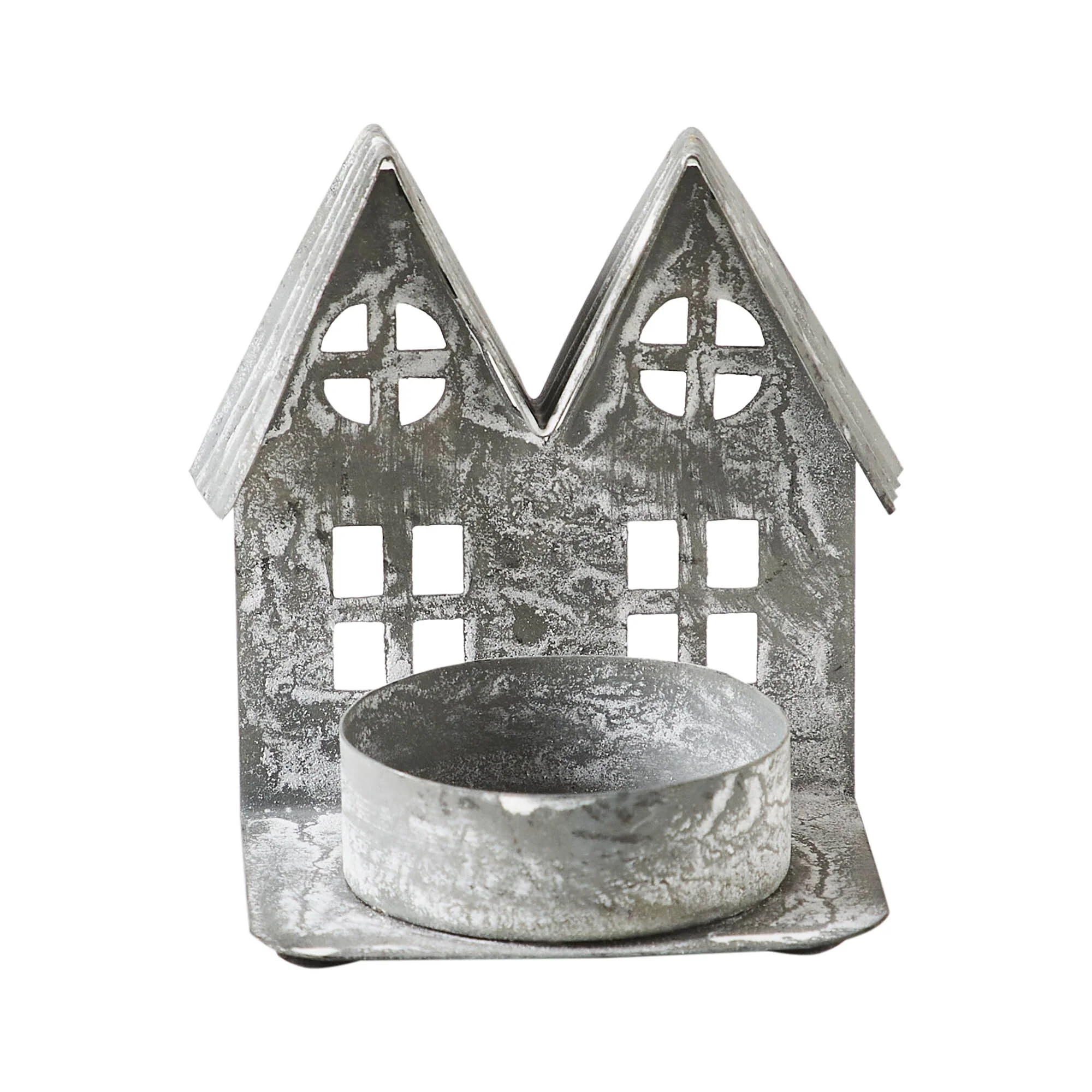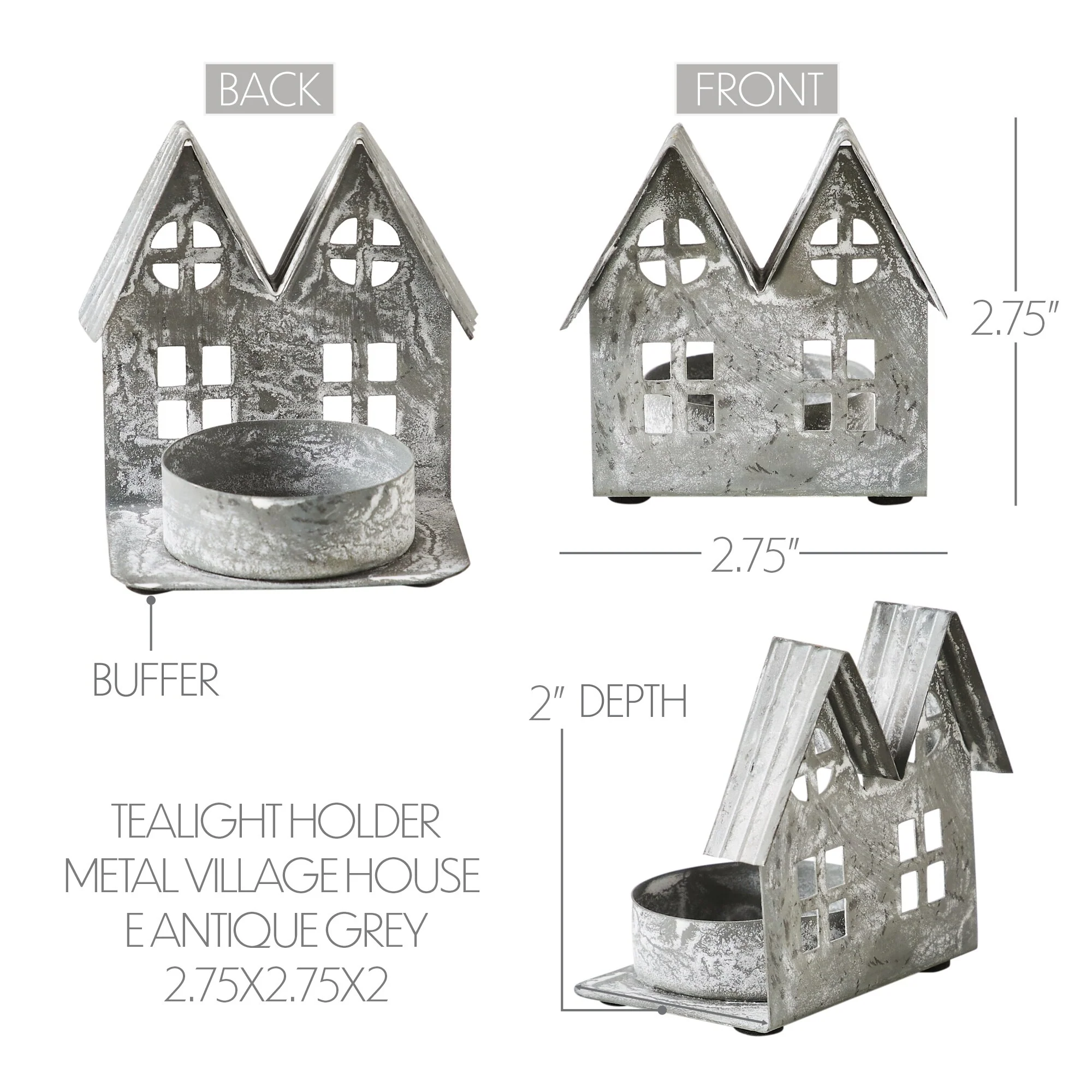 Add a touch of rustic charm to your home decor with the VHC Brands Metal Tealight Holder in Antique Grey. This delightful candle holder features the silhouette of a country house adorned with cutout windows, evoking a sense of primitive elegance. Crafted from sturdy metal and finished in antique grey, it boasts a distressed appearance that enhances its rustic appeal, making it a perfect addition to primitive and antique-themed interiors. Measuring 2.75x2.75x2 inches, this tealight holder is compact yet impactful, making it suitable for adorning your kitchen, dining table, entryway, or living room with soft, flickering candlelight. Its versatile design allows it to be placed in various rooms, infusing your space with warmth and ambiance. However, it's crucial to exercise caution when handling this candle holder, adhering to the instructions to ensure safety and prevent accidents. Cleaning and maintaining this metal village house candle holder is effortless, requiring only a soft cloth for wiping clean. Its antique grey finish effortlessly complements a wide range of color schemes, while its primitive and rustic design adds character and nostalgia to your home decor. Elevate the cozy ambiance of your living space with this charming tealight holder, providing a quaint accent that enhances the primitive and rustic allure of your interior design.