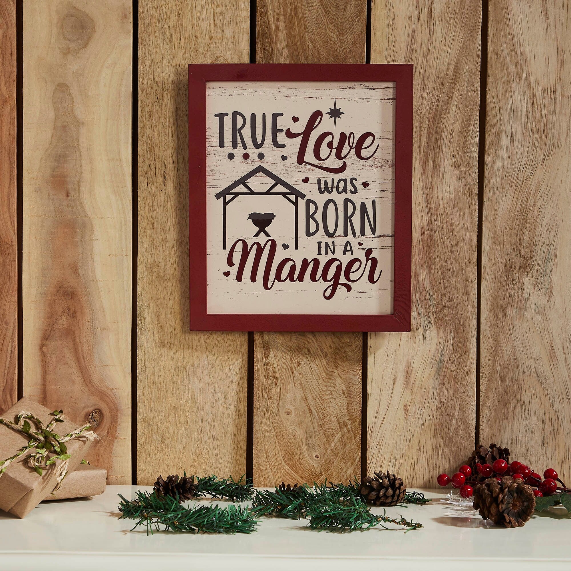 Enhance the spirit of Christmas in your home with the VHC Brands True Love Was Born In A Manger Framed Wall Hanging Sign. Measuring 12x10 inches, this rectangular sign serves as a beautiful holiday wall and door decoration, perfect for adding a touch of festive charm to any room. Crafted from MDF, this sign features a timeless message, True Love was Born in a Manger printed in elegant text against a backdrop of light creme, Christmas red, and dove grey, evoking a cozy country Christmas theme. Designed for both style and durability, this framed wall hanging sign is easy to maintain and can be wiped clean with a soft cloth, ensuring that it remains looking fresh throughout the holiday season. The distressed appearance adds rustic flair to the design, while pre-drilled holes offer convenient options for standing display, allowing you to showcase it in your bedroom, dining room, entryway, kitchen, living room, or any other space in your home.With its heartfelt message and charming design, the VHC Brands True Love Was Born In A Manger Framed Wall Hanging Sign serves as a poignant reminder of the true meaning of Christmas. Whether hung on a wall or door, this delightful decoration spreads the message of love and joy, creating a warm and welcoming atmosphere for family and friends to gather and celebrate the holiday season together.