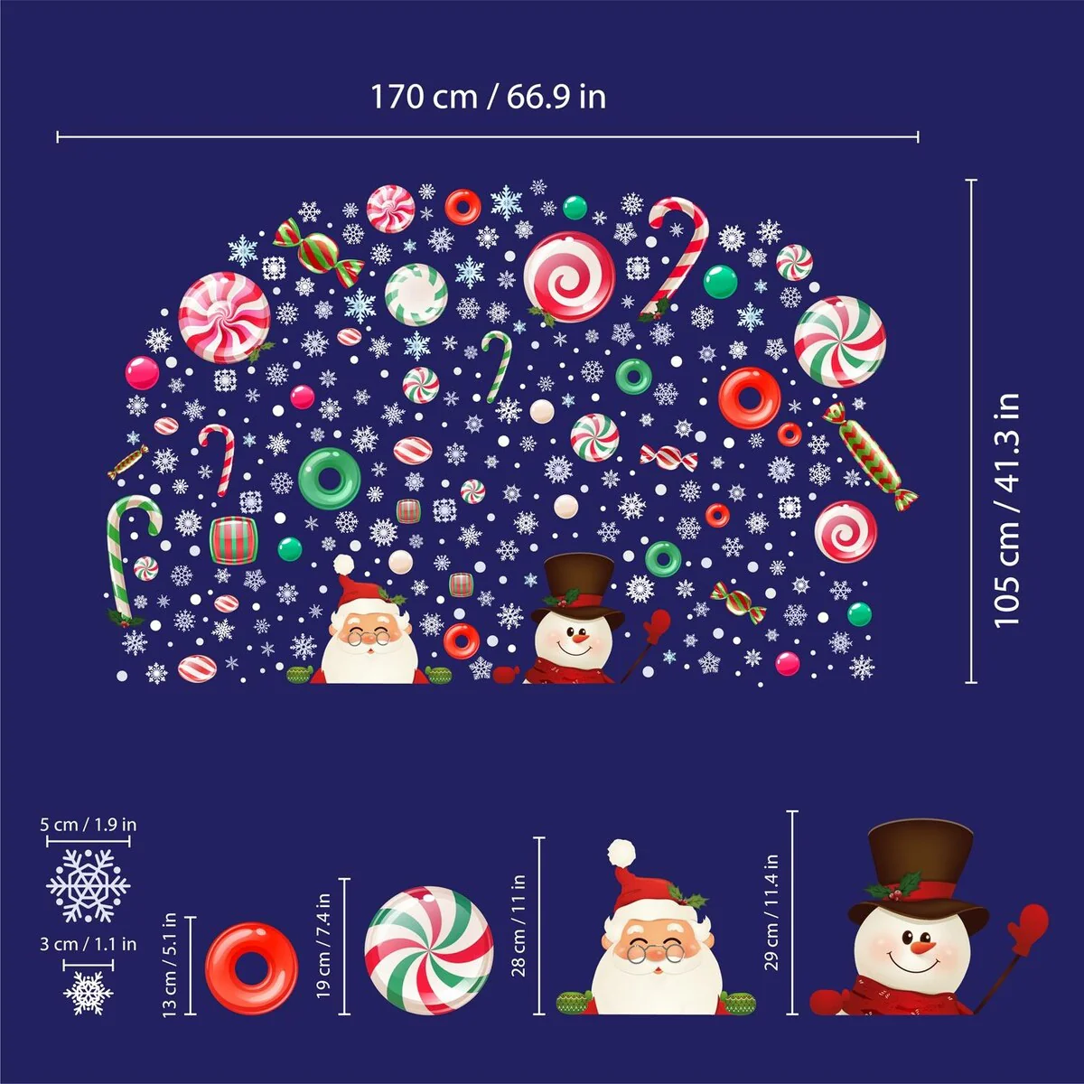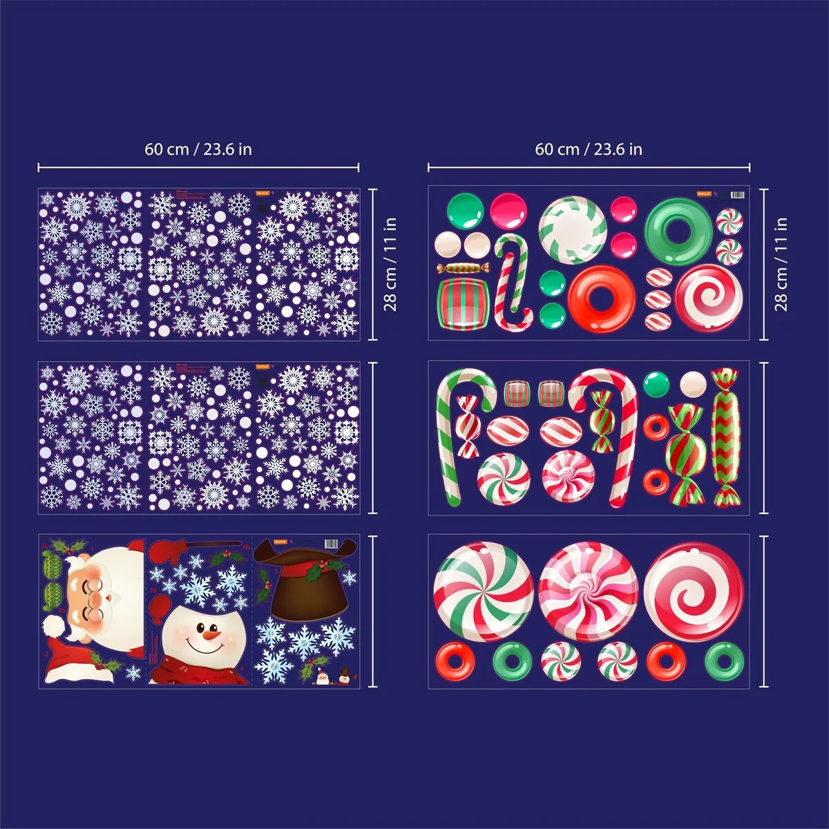 Let it snow this Christmas with our Santa And Snowman in Snowy Candyland Stickers Set! Our special snowflake stickers can be applied anywhere - on your door, fridge or window - you decide! To apply, peel and stick onto any clean, flat surfaces like walls, furniture or a window screen, and you are good to go! Easy to install and remove without leaving a trace. It can be easily trimmed/cut to fit. Application Notes: Please only attach to the painted surface at least three weeks after painting and clean the surface before application. Stickers applied on laminated or wallpapered surfaces cannot be removed. DO NOT APPLY in places with direct contact to fire! Please note: The colour displayed on your monitor may vary slightly from the actual product. Package Contains 6 sheets of 28.5 x 60 cm with 352 pieces of stickers. Finishing size: 170 x 105 cm or 66.9 x 41.3 inches.