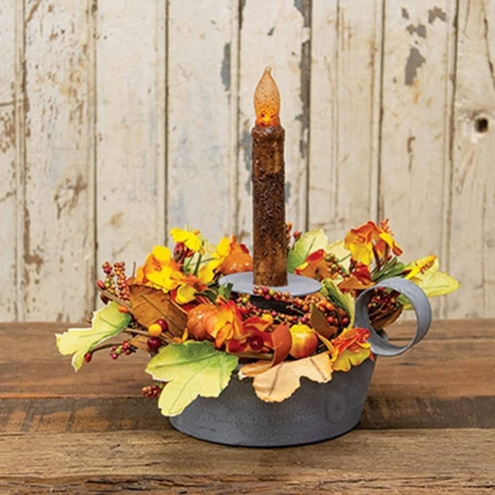This rustic grey tapered pan candle holder is crafted from durable galvanized metal and features a raised pedestal designed specifically for taper candles. Measuring 7 inches wide by 4.5 inches high, it showcases a weathered finish that adds a charming, vintage-inspired look to any space. The integrated strap thumb ring handle offers easy portability and adds to its classic farmhouse style, making it ideal for both battery-operated taper candles and decorative candle rings. This versatile candle holder combines practicality with a timeless aesthetic perfect for indoor or outdoor use.