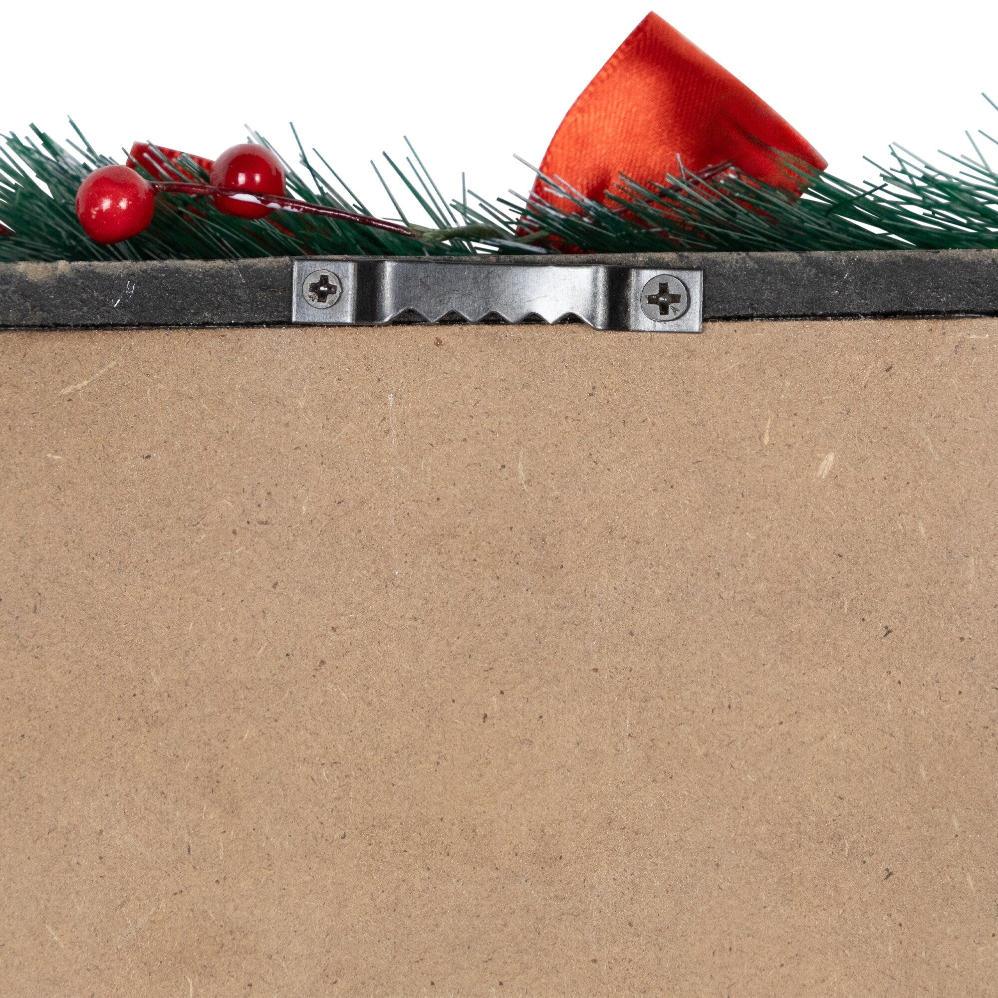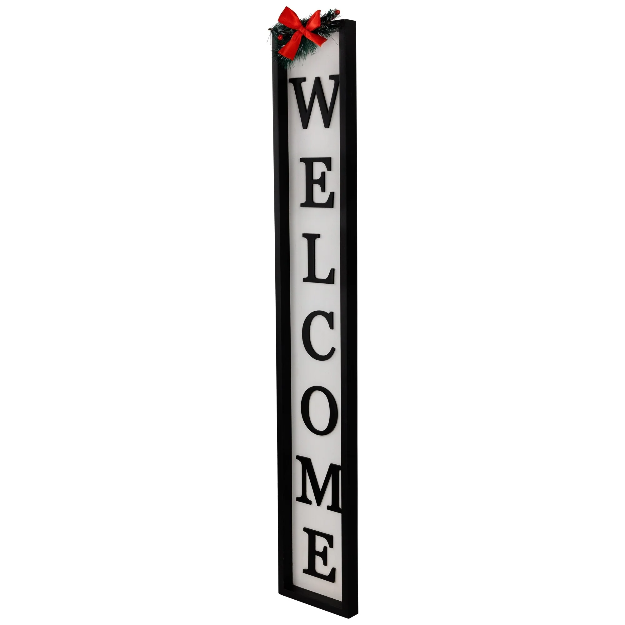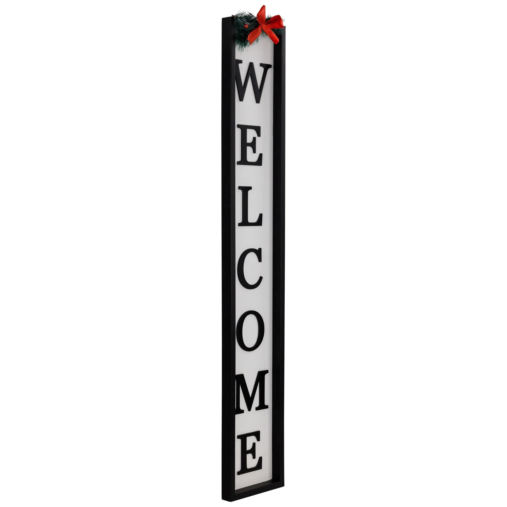 Greet your guest with this "Welcome" porch sign. The pine needle and berry red bow, adds a festive touch for the holiday season. Designed with a black frame it provides a striking contrast against the white background, complementing a wide range of d茅cor schemes. Lean on your porch or hang on foyer walls for a warm inviting feel.
