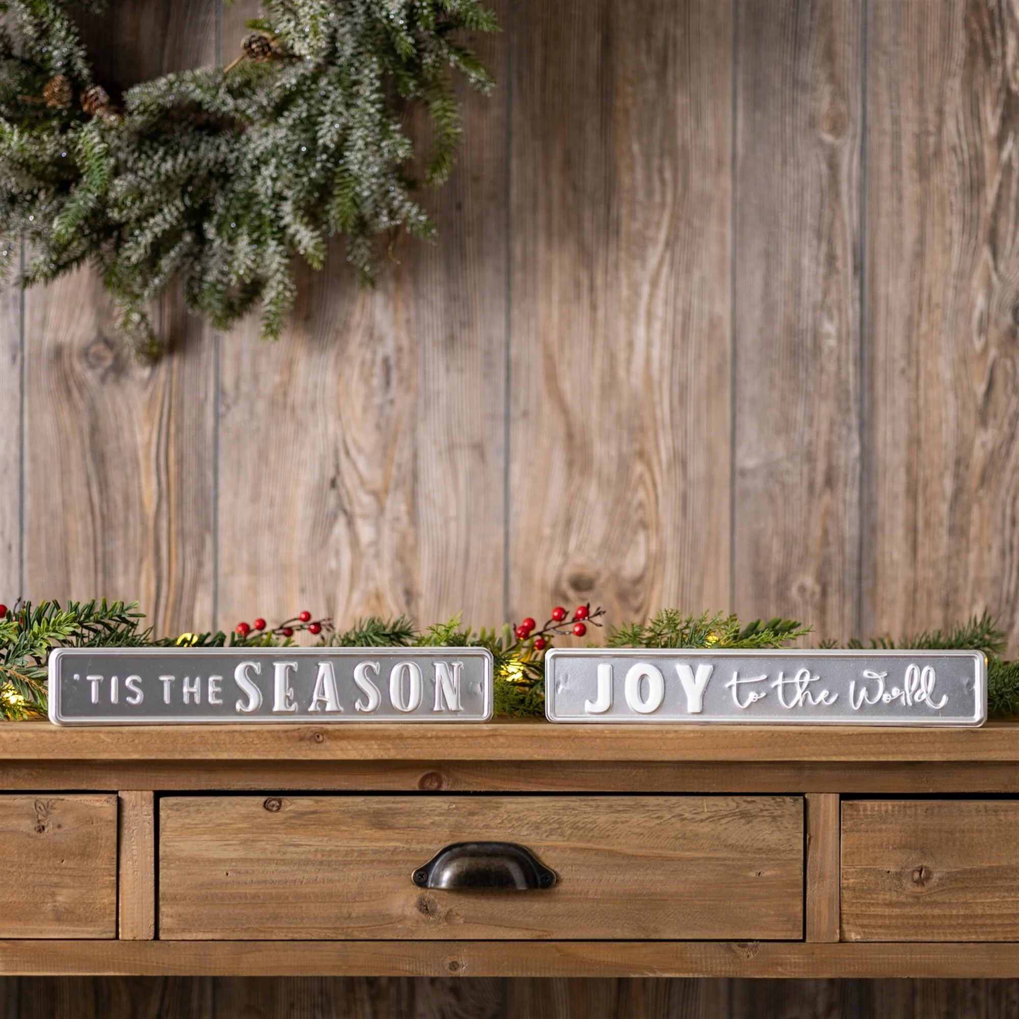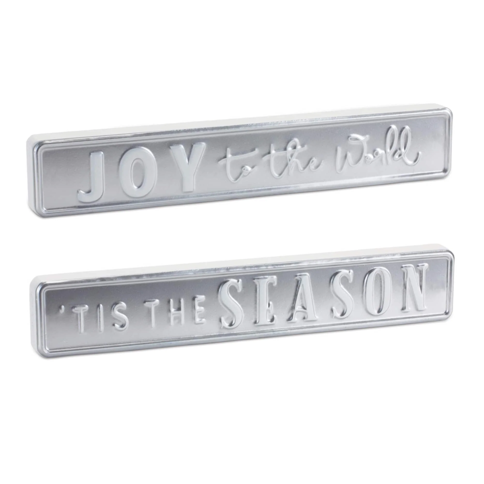 Set of 2 Silver Holiday Sentiment Signs with “Tis the Season” and “Joy to the World” for Indoor Decor - 12”L x 0.75”W x 2”H