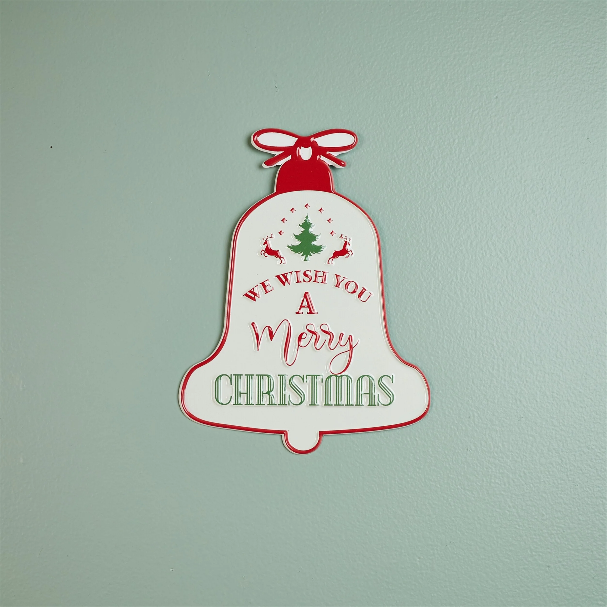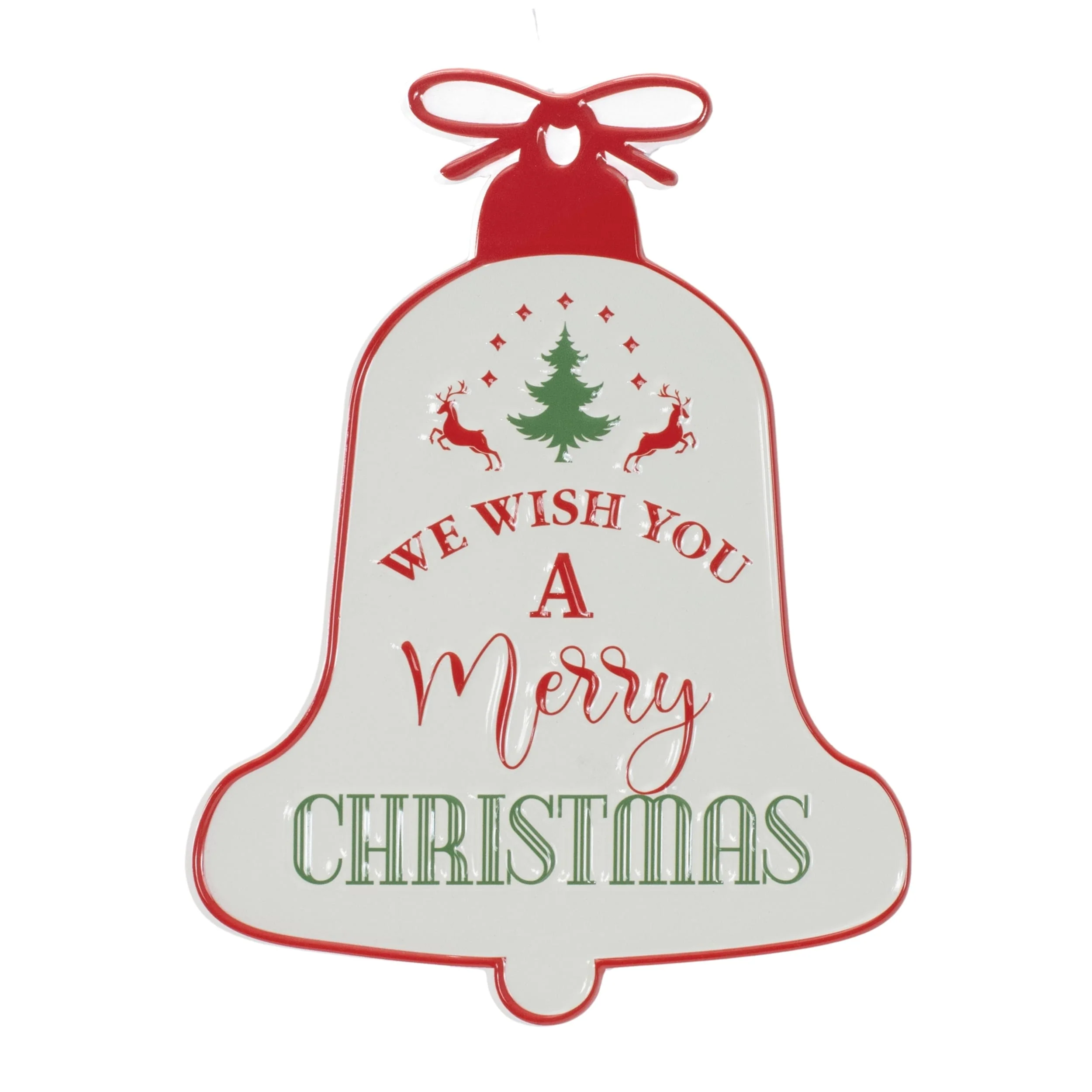 Holiday Metal Bell Sign with “We Wish You a Merry Christmas” Pine Tree Deer Indoor Decor - 7.5”L x 0.25”W x 9.75”H