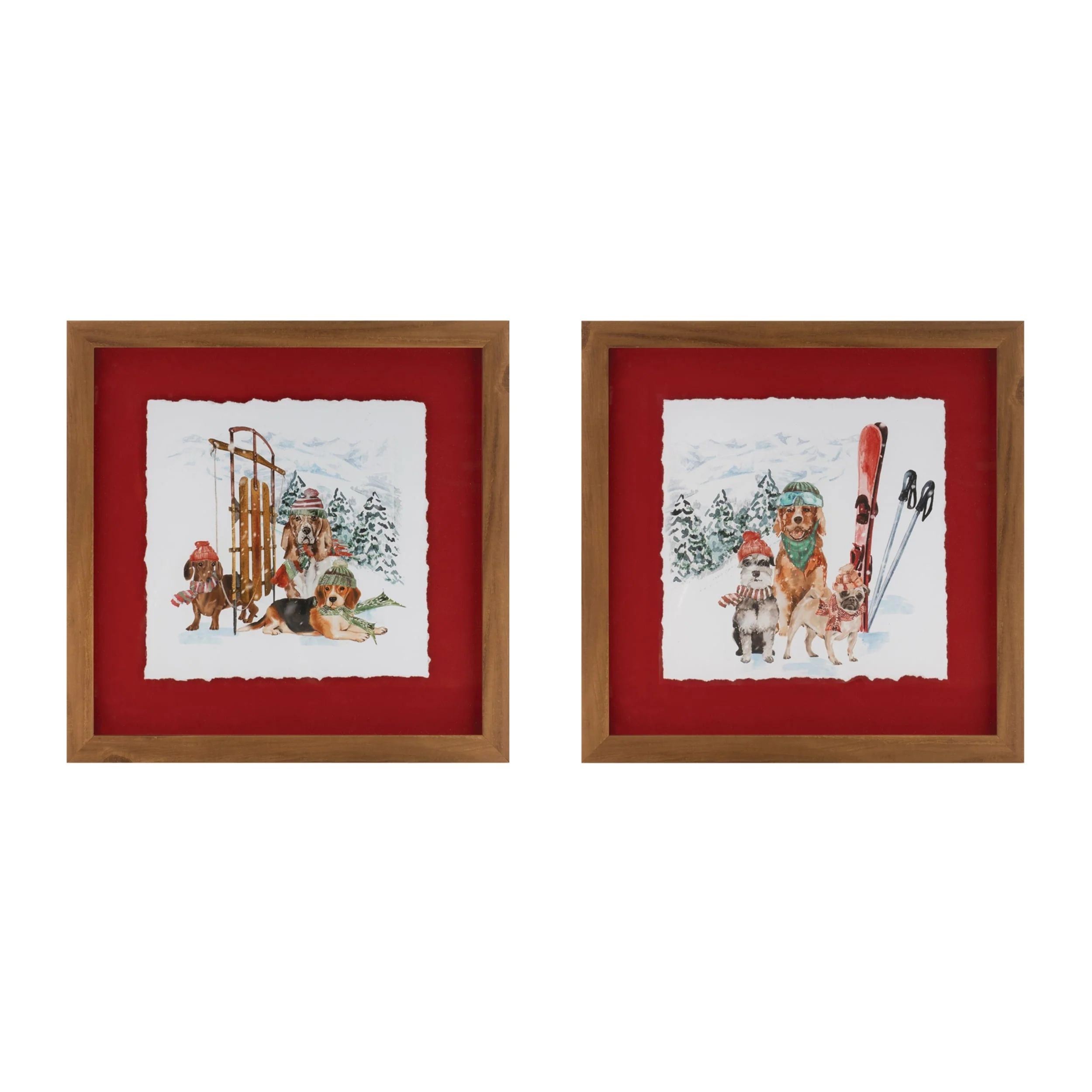 Set of 2 Winter Dog Art Prints with Sled and Ski Accents in Red Matte Glass Frames Perfect for Winter or Cabin Decor