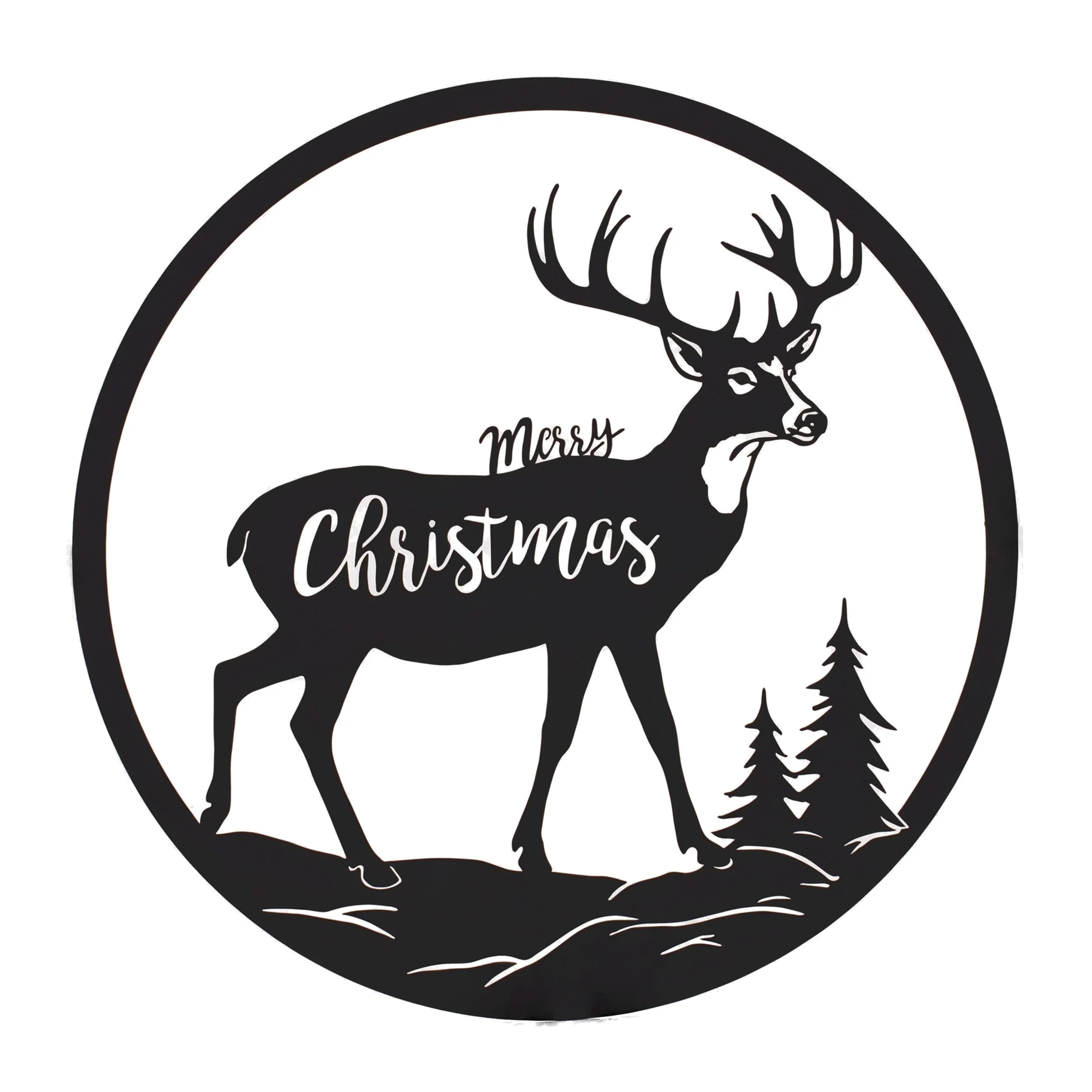 16” Round Black Iron Cut Metal Deer Plaque with Merry Christmas Sign Rustic Indoor Holiday Decor - 16”L x 0.5”W x 16”H