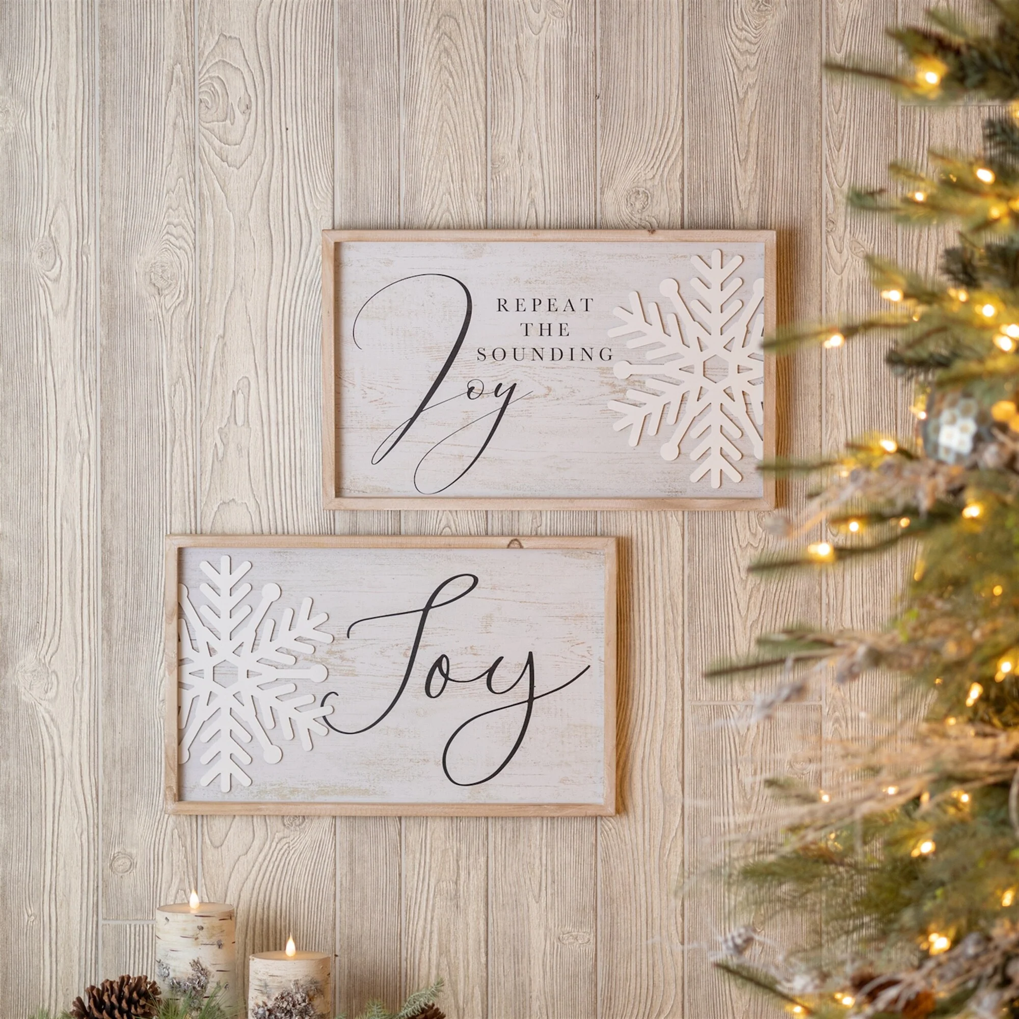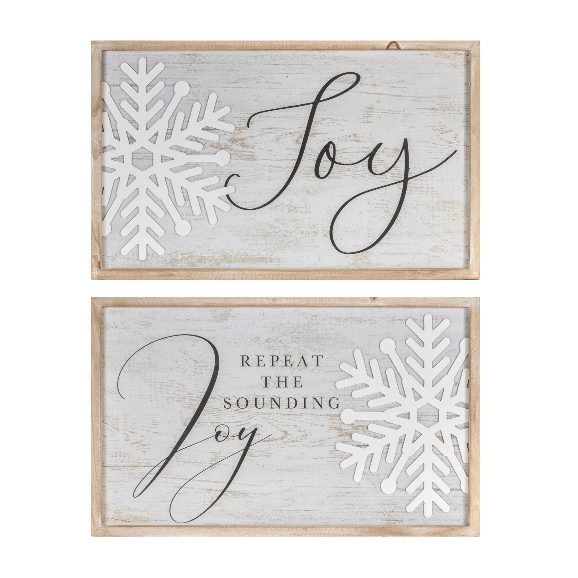 Set of 2 Holiday Wall Plaques in White and Beige with Festive "Repeat the Sounding Joy" Quote - 21”L x 0.75”W x 13”H