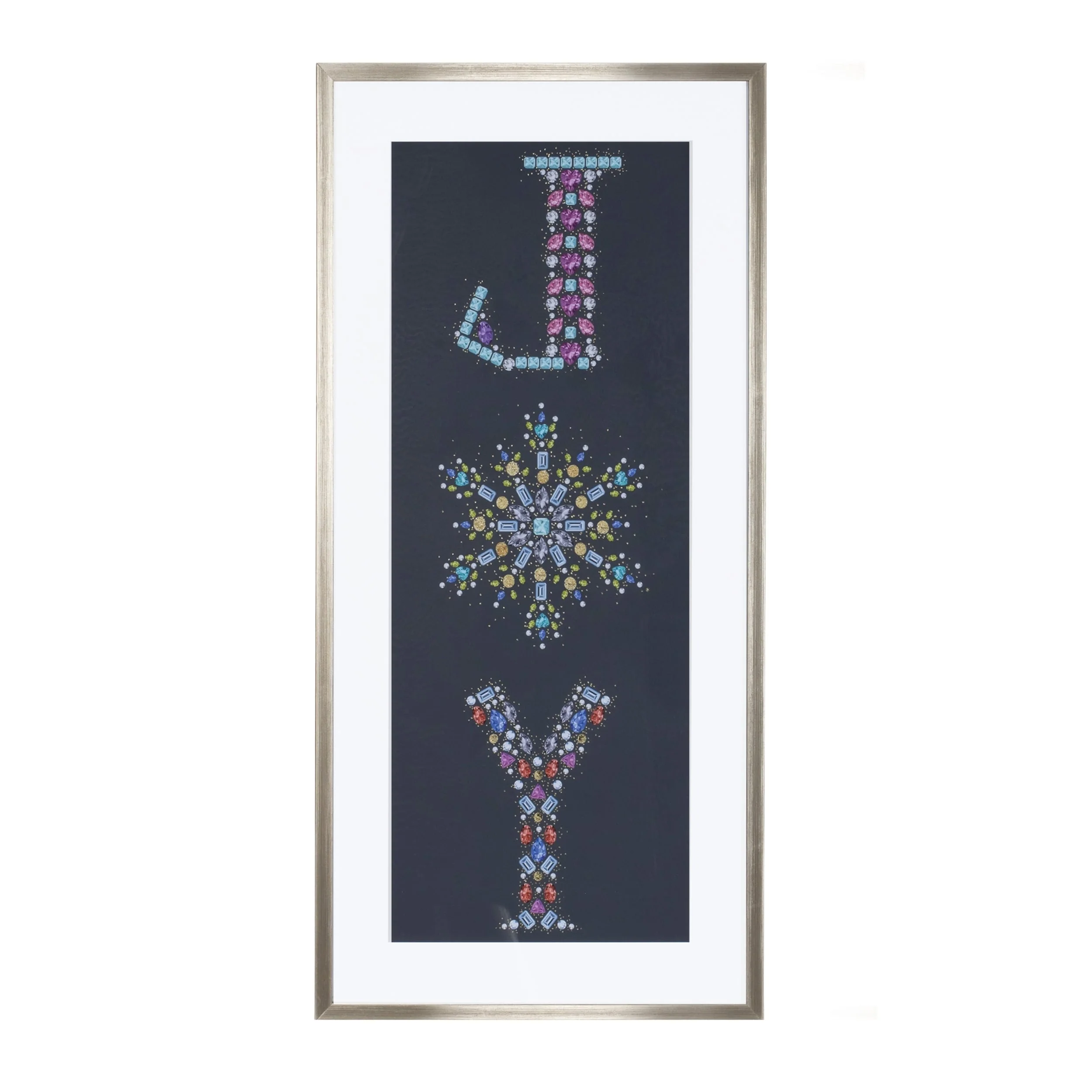 Blue White Holiday "Joy" Wall Hanging with Jewel and Glitter Design in Glass-Covered Champagne Frame - 13”L x 1”W x 23.75”H