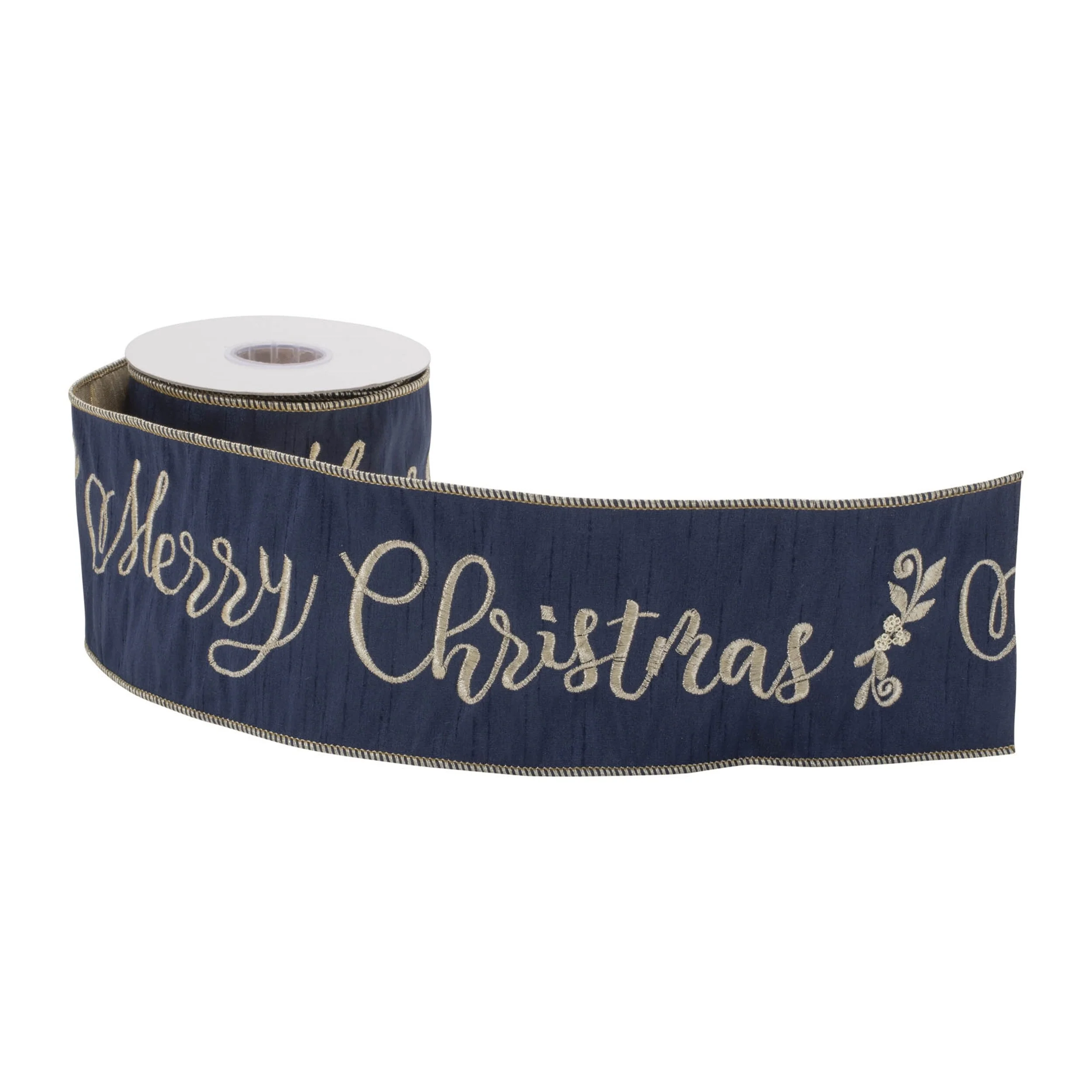Wired Christmas Ribbon Navy Gold Script 4 Inch x 5 Yards Roll - 180” x 4” x 0.25"