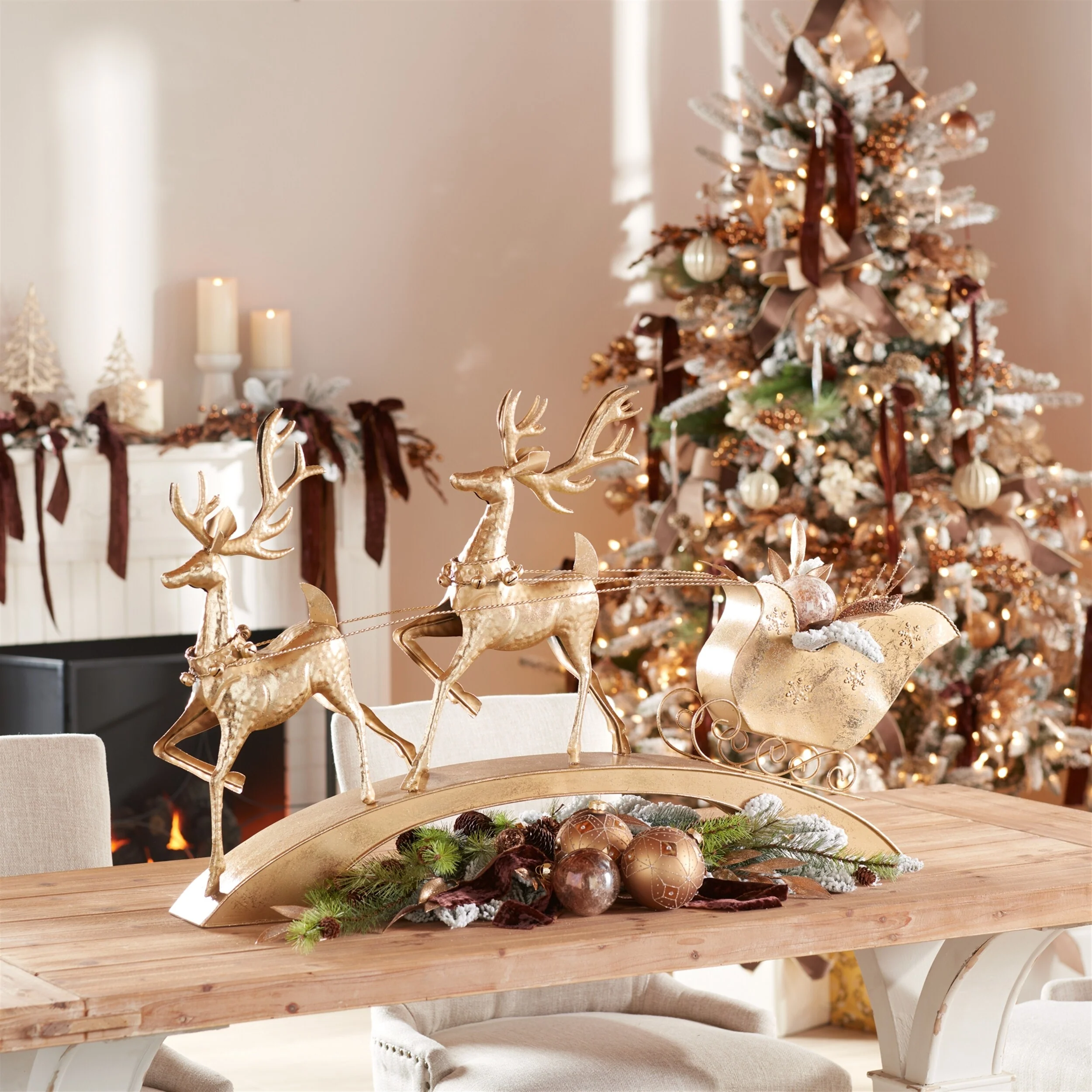 Large Gold Metal Deer with Sleigh Indoor Holiday Accent Decor - 42.5” x 4.75” x 25”