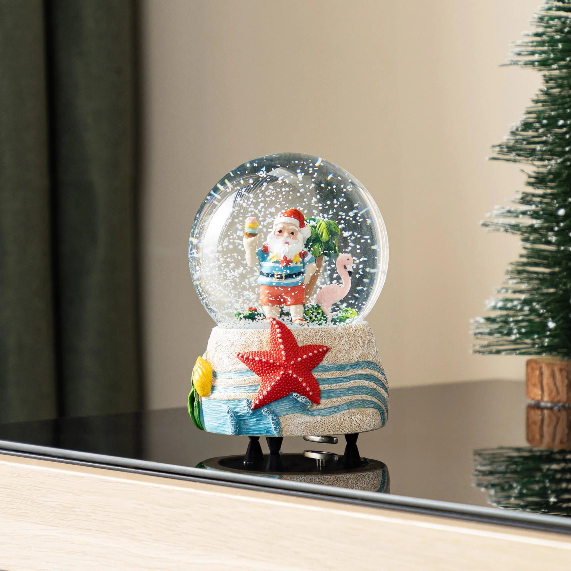 Glitzhome 100mm Christmas Resin Musical Snowflakes Santa on Vacation Waterglobe