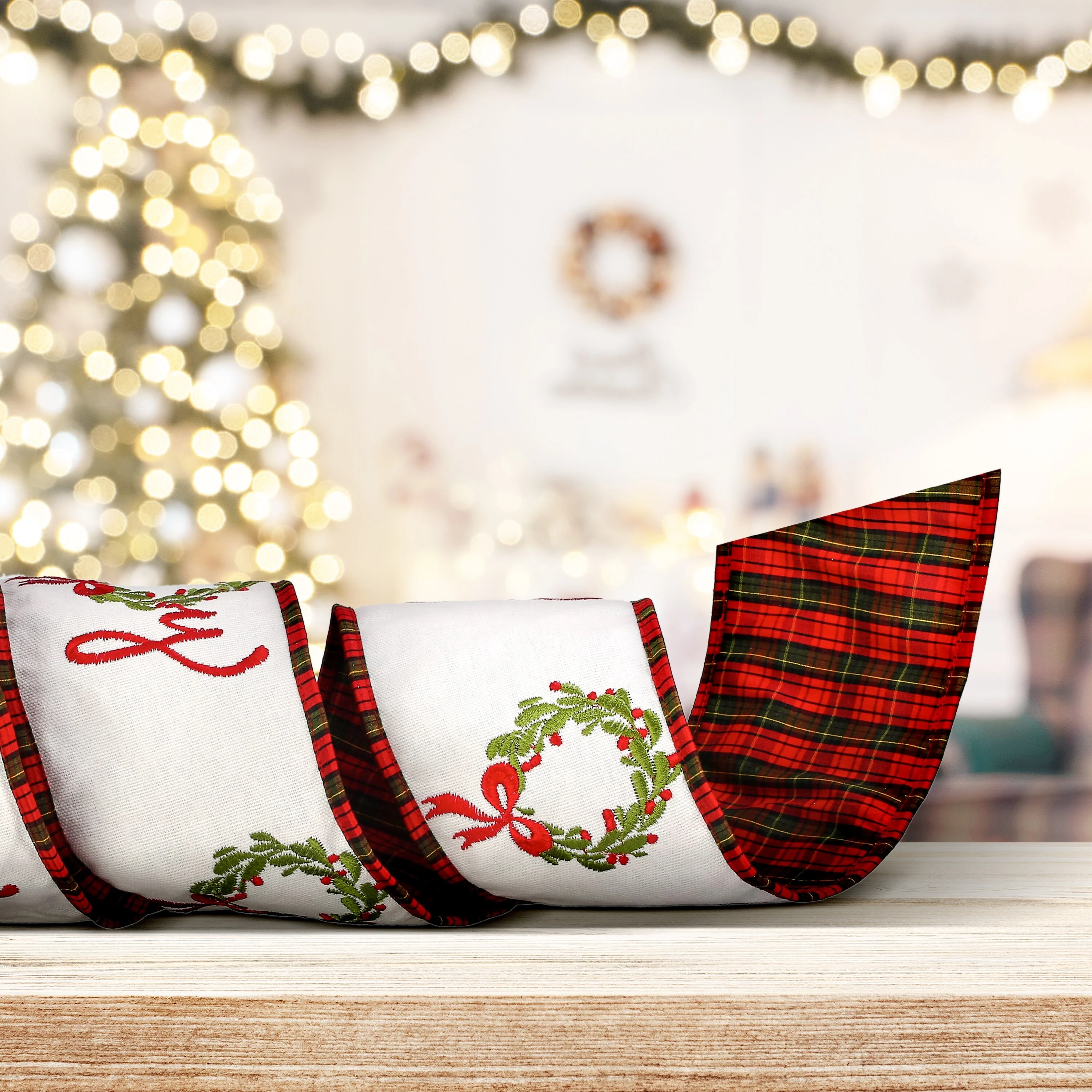 4"x 5Y "Joy" Wreath Dupion Plaid Back Ribbon