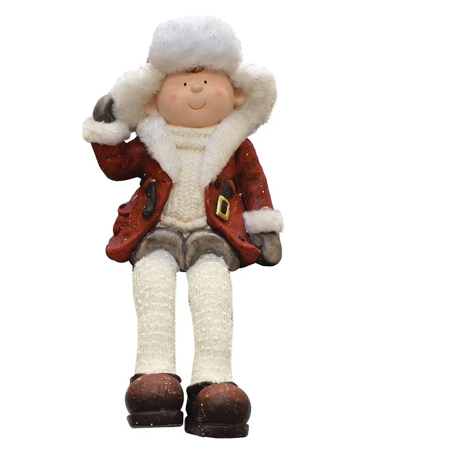 19" White Red Sitting Young Boy w/ Trimmed Ski Hat Christmas Figurine