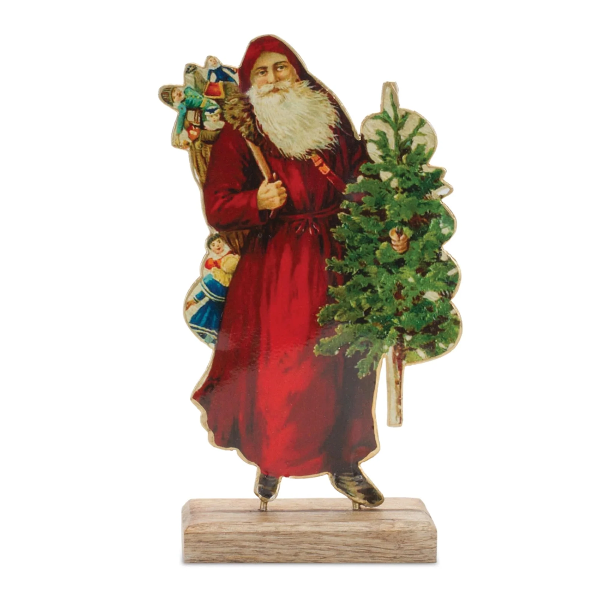 Red and Green Metal Rustic Santa Figurine on Wooden Base Holiday Decoration for Shelf or Mantel - 5.5”L x 2”W x 8.25”H