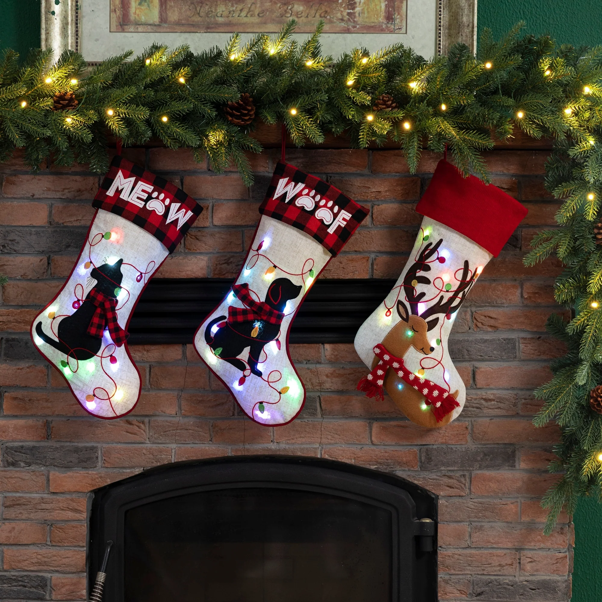 Glitzhome 21"L LED Embroidered Linen Reindeer Cat Dog Christmas Stockings