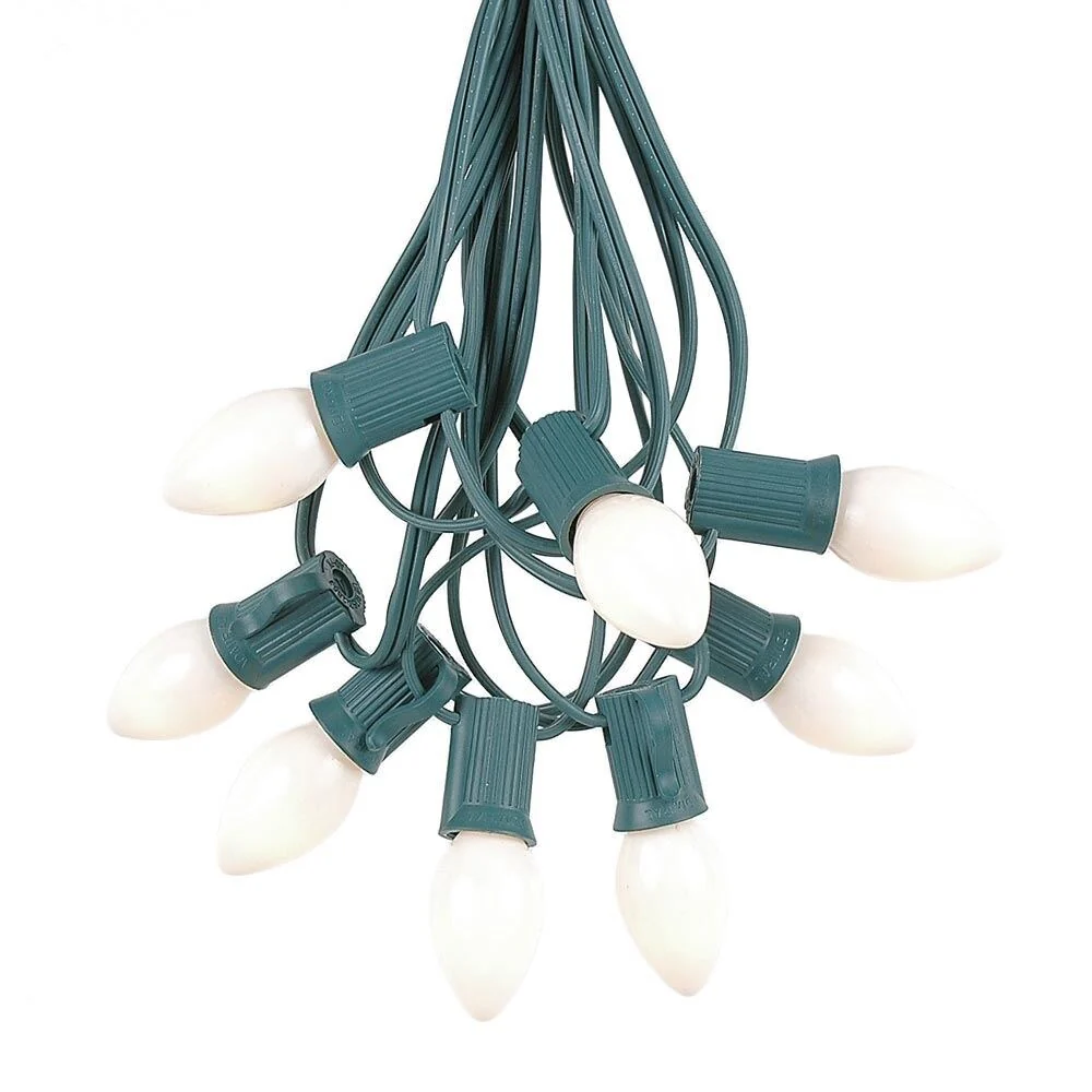 Novelty Lights presents this Christmas C7 opaque string light set with 100 bulbs, perfect for outdoor patios, special event, or Christmas lighting. Typically you use these on your house roofline, on your Christmas tree, or around your patio to create a cheerful atmosphere. Each set includes 100 long life C7 bulbs on a Green wire stringer with 100 sockets that are spaced 12" apart. We provide you with 25 extra bulbs at no charge to used for replacements. These durable ceramic C7 light strings have long lasting 3,000 hour bulbs and are on a 20 gauge Green wire. These durable and heavy duty C7 outdoor light strings will provide you with years of maintenance free use. We recommend purchasing an extra box of bulbs to have on hand to be used for replacements (ASIN B004OZRX1G).