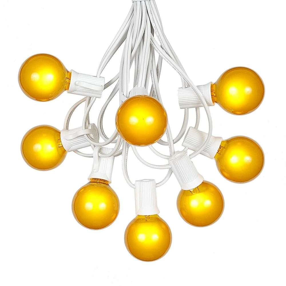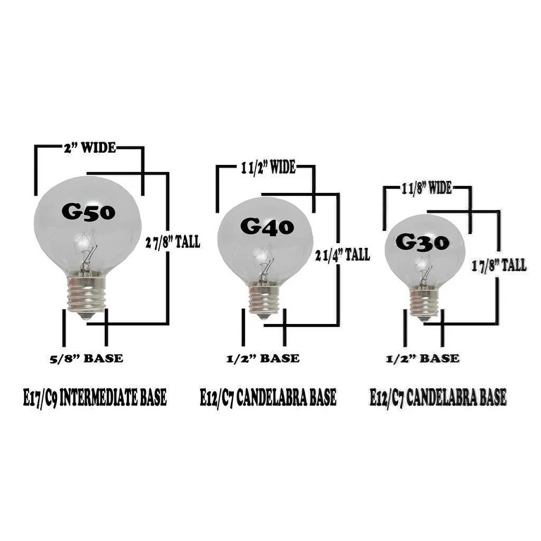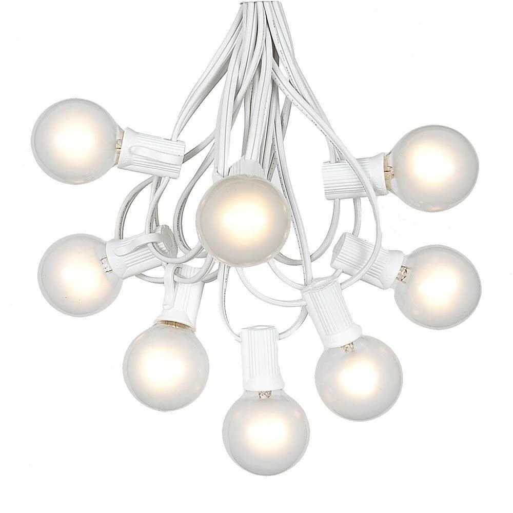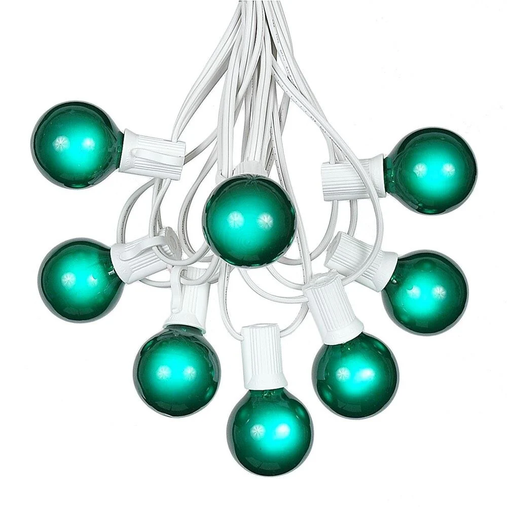 Our G40 globe string light set with 125 bulbs is perfect for outdoor patios, decks, special event or Christmas lighting.  Our G40 bulb is a C7/E12 candelabra base and comes with a C7/E12 candelabra string.  Each set includes 125 globe shaped bulbs on a White wire stringer with 100 sockets that are spaced 12" apart.  We have Included the extra 25 bulbs free of charge for replacements as a complimentary service.  These G40 light strings have long lasting 3,000 hour bulbs and are on a 20 gauge White wire.  All our G40 light strings use patented Admiral Brand sockets. These durable and heavy duty light strings will provide you with years of maintenance free use.