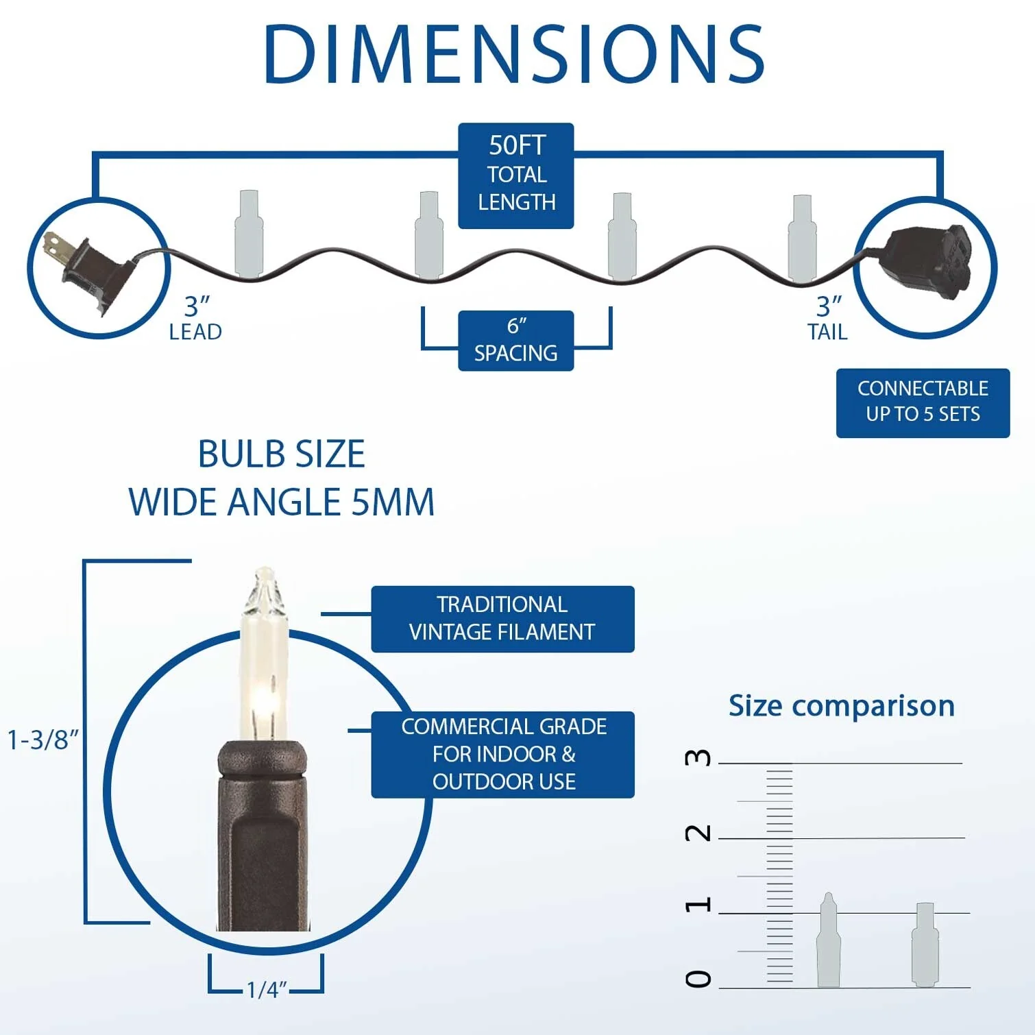 Illuminate your spaces with Novelty Lights' 100 Light 50 Foot Holiday Mini Light String Set, a perfect blend subtle charm and festive exuberance. Perfect for both indoor and outdoor use, the commercial grade wire comes in a variety of colors so that can seamlessly blend with your decor and enhance the ambiance of any setting.This 50 feet long string features 100 mini lights, 6-inch socket spacing, end-to-end connections, and stackable plugs, making these Christmas lights perfect for projects small or large.Experience that nostalgia of traditional Christmas lights built with modern needs in mind. With the convenience of connecting up to 5 sets end-to-end or stacked at the plug, these tiny lights can brighten big spaces. Consuming just 40.8 watts (0.34 amps) per set, they are a low-wattage, cost-effective solution.Equipped with a fused plug and 2 additional 3-amp fuses, these string light bulbs ensure safe operation. The set also includes 2 replacement bulbs and 2 flasher bulbs, along with a series parallel circuit that ensure the string stays lit if a bulb burns out.From trees to indoor spaces, weddings to restaurants, these string lights are perfect for any decorative lighting application. Their soft light enhances the beauty of any setting, making potential applications and possibilities virtually endless.