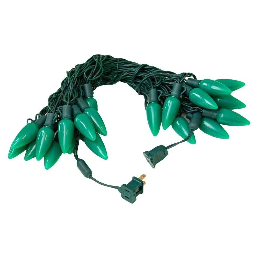 Illuminate your festive celebrations with our string lights 25 ft that cast a magical glow. These 25 Lamp C9 Ceramic LED String Lights Sets are designed with a commercial grade wire, perfect for both indoor and outdoor spaces. Adding a touch of enchantment to your holiday season, these outdoor string lights led offer aesthetic appeal and versatility, making them a holiday essential for every home. Our string light wire allows you to cover larger areas with ease. The 25' long string lights feature a 12" bulb spacing, ideal for decorating expansive trees and rooflines. These bulb string lights can connect up to 43 sets end-to-end, offering a seamless and professional finish. Being UL Listed for both indoor and outdoor use, these lights are not only versatile but also safe.Experience the durability and longevity of our 'c9 green Christmas lights'. These commercial-grade lights with non-removable bulbs provide a steady and consistent light source, eliminating any flickering. Enhancing the overall visual appeal of your 'Christmas house light', this feature makes your decorations truly shine.Save on your energy bills with our outdoor lighting products. These energy-efficient string lights use only 4.8 Watts per string, making them not only environmentally friendly but also cost-effective. Our 'Christmas light cable' comes with a built-in rectifier, eliminating the need for a special adapter and adding to the convenience of using these lights.Set up your 'Christmas tree light' effortlessly with our general mounting tips. For outdoor patios, we suggest using 'aircraft wire' as a support cable for a clean, professional look. When using our 'string lights 25 ft' for rooflines, mount along the roofline following our all in all clips to mount under shingles or on gutters, ensuring a straight, secure line along your home.