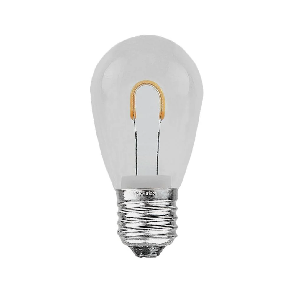 Novelty Lights Warm White S14 U-Shaped Flexible Filament LED Plastic Filament Retrofit replacement lamps, utilize a Flexible (U-Shaped) Filament design for veiwing from all angles. Switch out those old incandescent S14 bulbs that consume too much energy and break all time for our energy efficient Retro-fit S14's utilizing LED filament technology. Our bulbs are made of a quality plastic providing a durable LED S14 that will not chip, fade or crack. These Warm White S14's are also dimmable making them perfect for animated displays. All of our LED S14's are energy efficient using only 1 Watts per bulb. Built to last with a 2 season warranty. Our S14 plastic filament LED bulbs will provide years of quality use. Perfect for roofline, patio, backyard BBQ, or other Holiday installation. Our Warm White plastic S14 bulbs can be used with any of our E26 commercial grade light strings. The bulbs are sold in packs of 25.