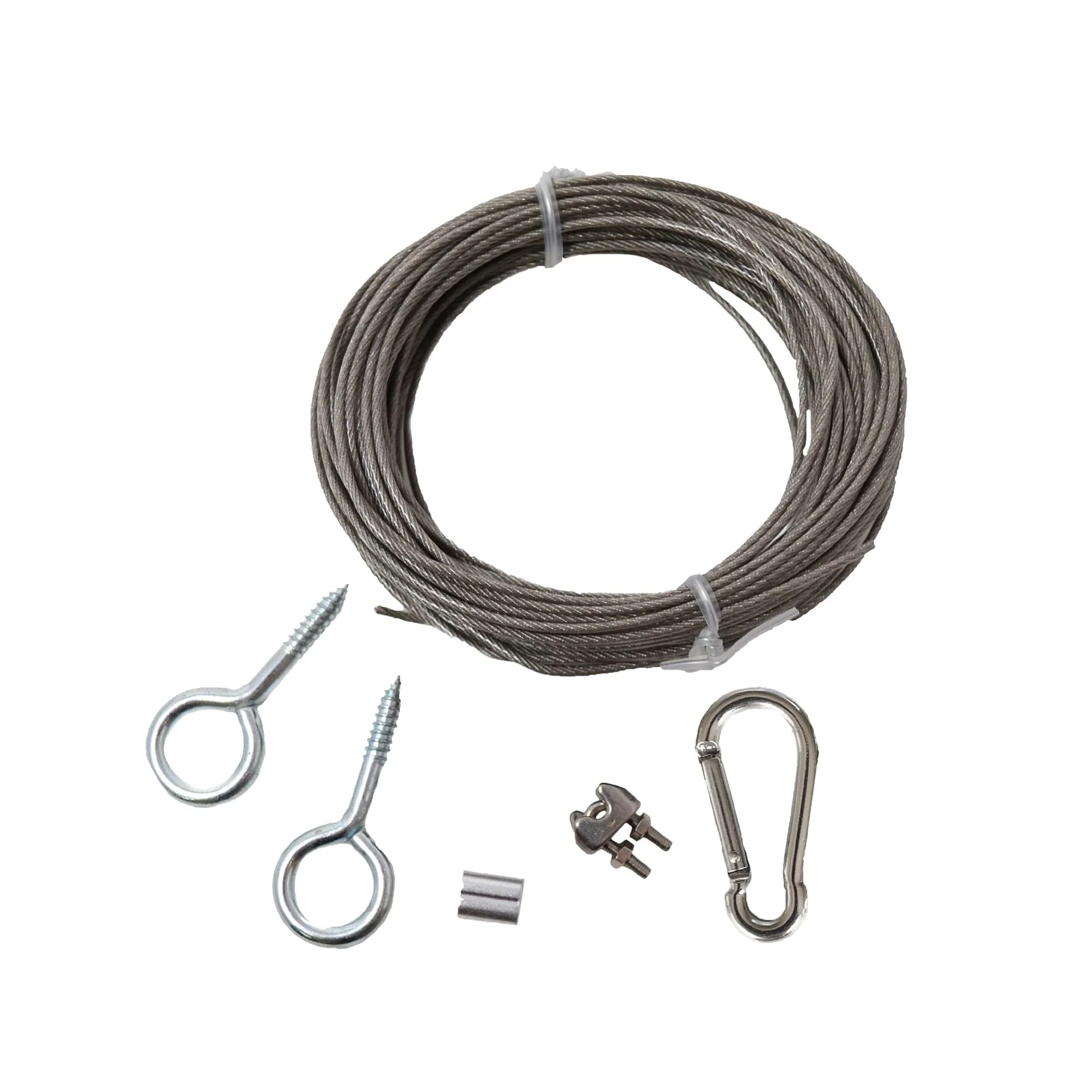 Kit includes: 1ct 40ft Cable Wire, 25ct Cable Wire Clips, 1ct Carabiner, 1ct Adjustable Metal Crimp, 1 Metal Crimp and 2ct hook and eye bolt screws