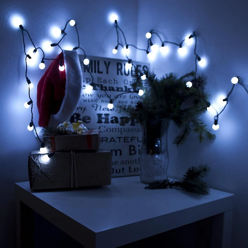 Use the string lights to cover virtually any area or structure and increase the visual appeal in your setting, perfect for spice up your decoration.Add welcome feeling to your party, restaurant, shop, walls, window, doors, floor, celling, grass, Christmas tree, etc...Great for landscapes, grass area, decks, docks, and more.The string light has high brightness. Power: 110V.Color: White. 50 LED Lights. Effect: Flash. Extension Lead.Overall Length: 16 Feet. Power cord length: 5 Feet.LED Casing: Small Ball. Lot of 2.