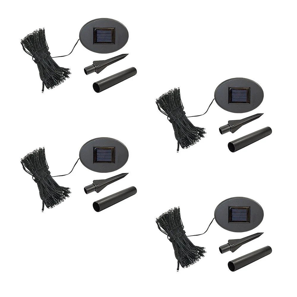 No energy costs. No outlet needed.Solar panel converts sunshine into electricity during the day and lights turn on automatically at night. Lights stay lit for more than 8 hours at night.Easy to operate and install. Solar panel comes with garden stake.Create an enchanting warm atmosphere in your home, garden, patio, lawn, porch, or yard and illuminate the night with these beautiful lights.100 lights. 35 feet in length. Color: White. Mode: Steady, flash. Set of 4
