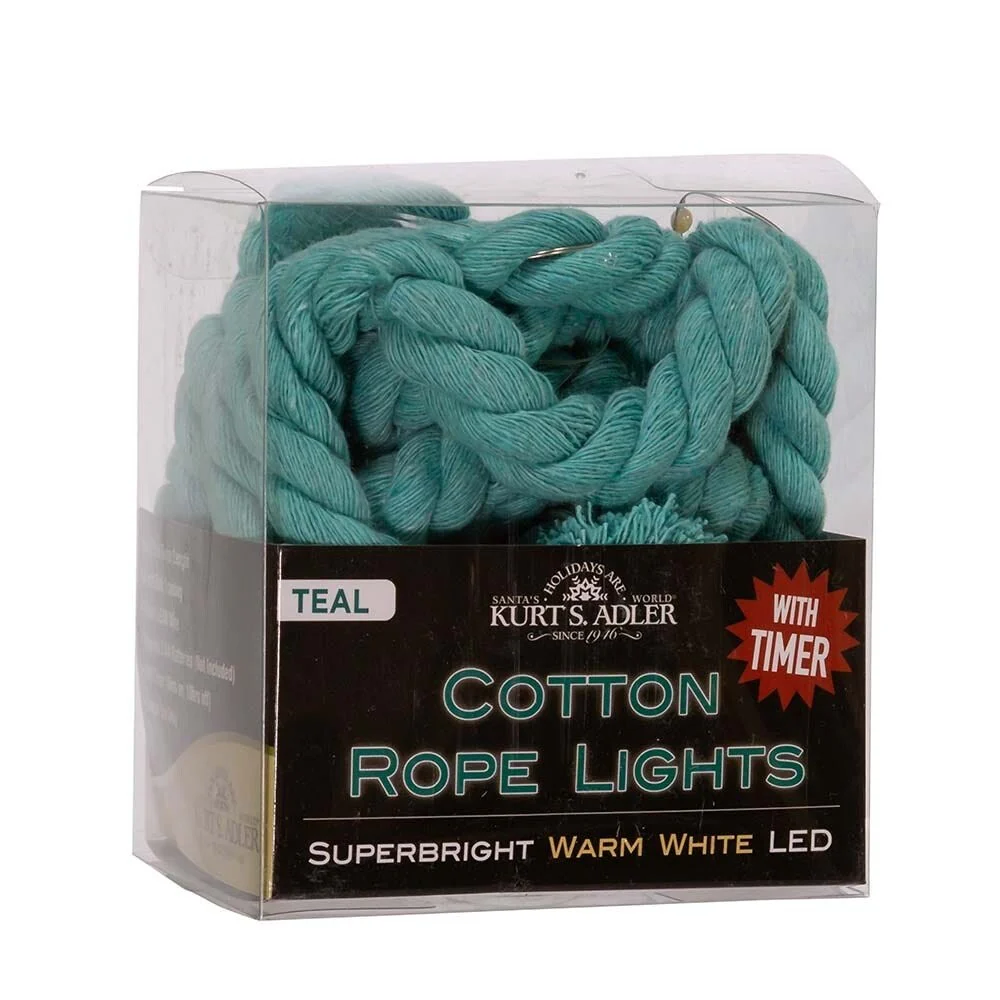 This 30-Light 9.8 Foot Battery-Operated Teal Rope with Warm White Superbright LED Light Set from Kurt Adler is a lovely holiday decor. Each rope light set has 30 warm white superbright LED lights and silver wire for easy decorating. Includes 24" lead wire, 4" led bulb spacing, and timer options (6 hours on/18 hours off). This set requires 3 AA batteries, which are not included. This unique light set offers a wide variety of uses and would be a terrific addition to any indoor holiday décor.