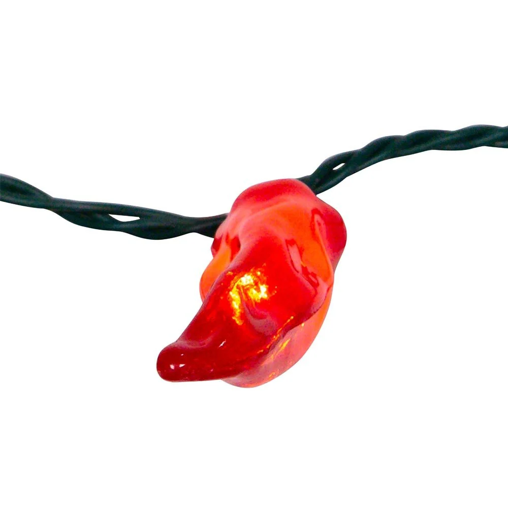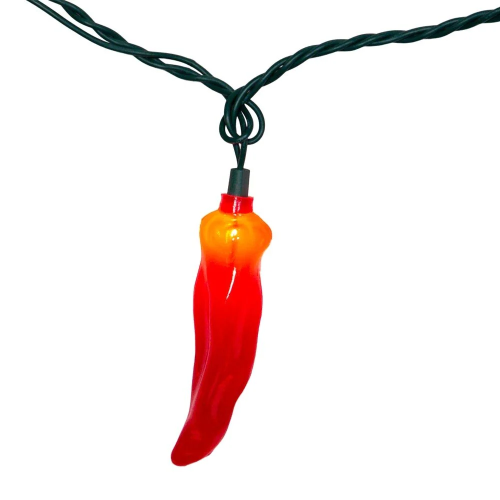 The UL 10-Light Red Chili Pepper Light Set from Kurt Adler is a great way to add to the lighting of your holiday or theme party décor! Each of the 10 lights in this set features a bright, detailed red chili pepper design--perfect for adding some spice wherever they are strung! Each set is designed to include ten 6 inch red chili peppers for indoor or outdoor use. The 10 lights are spaced 12 inches apart with a 30 inch lead wire and 6 inch tail wire for a total of 144 inches.