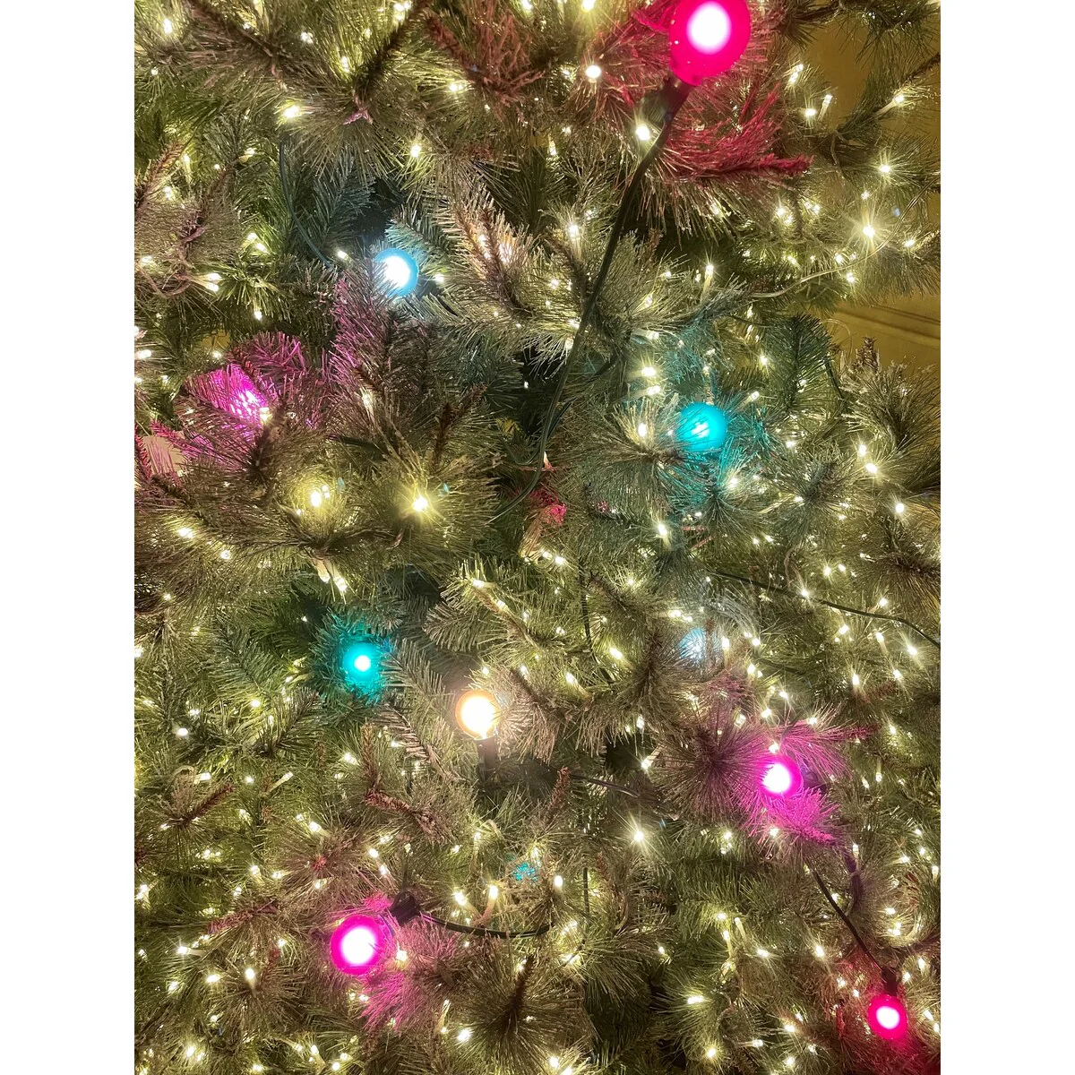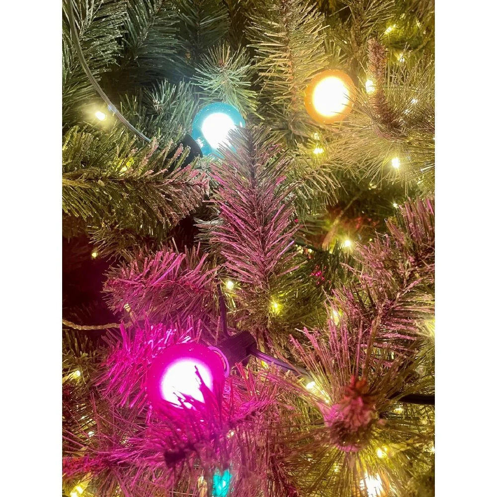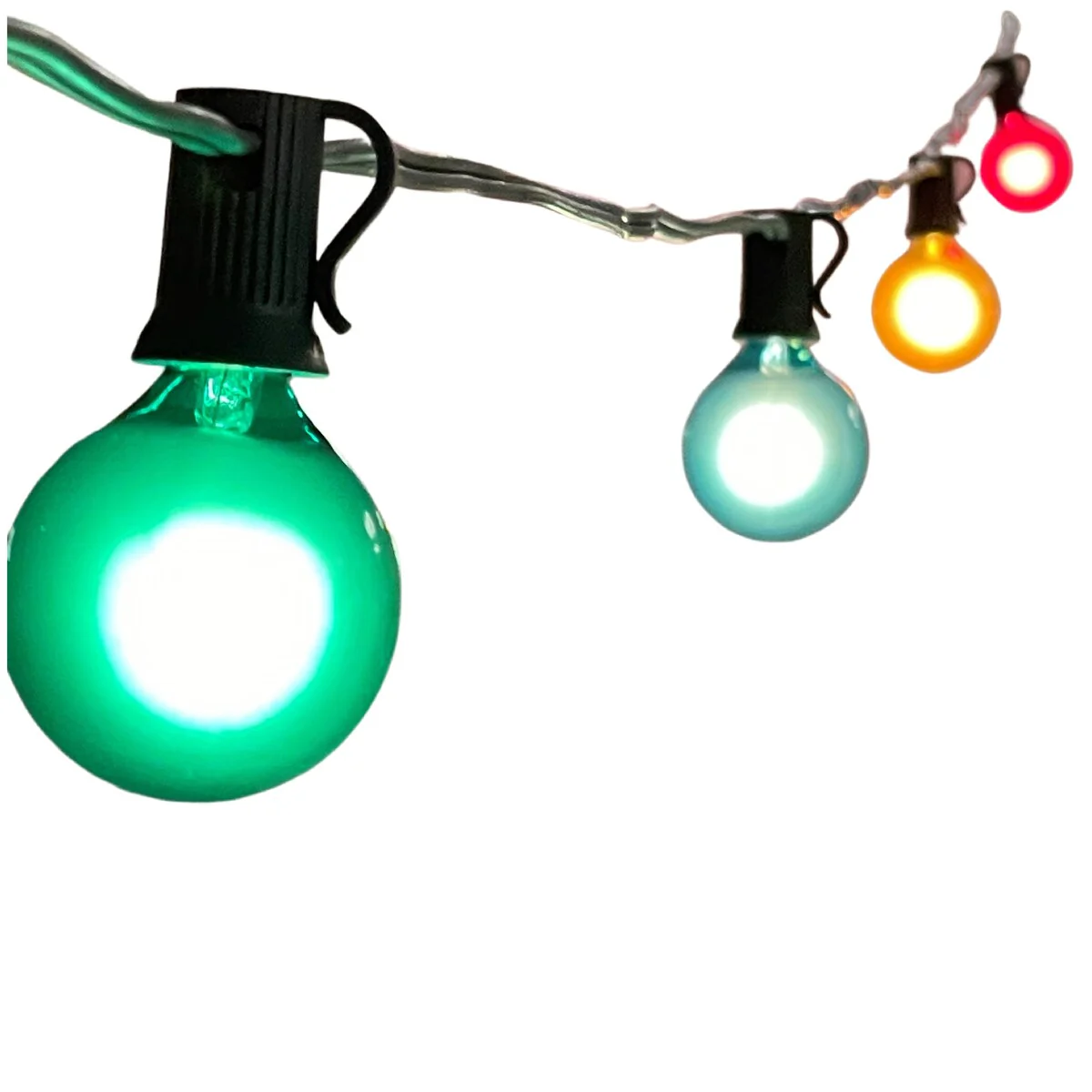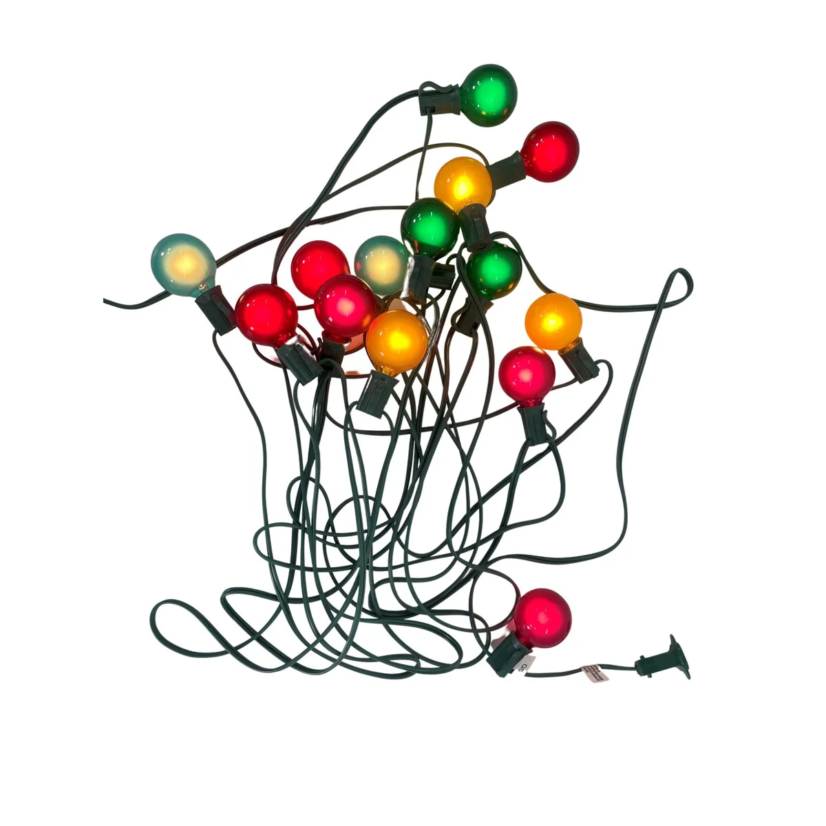 Add color and interest to any tree or mantle with this light string of G40 bulbs. These 1.5 inch bulbs provide great impact and layering to your decorations with their size and frosted glow. 24 in spacing between each bulb makes for easy spacing and coverage. Light string has end to end connection and can handle connecting up to 6 sets together. Size: Overall 28 feet, 30 inch lead cord, 24 inch spacing between bulbs, End to End Connection up to 6 strands., UL Approved for Indoor or Outdoor Use, 15 G40 Bulbs Provided, 3 Bulbs Each of Red, Yellow, Pink, Turquoise, Green.