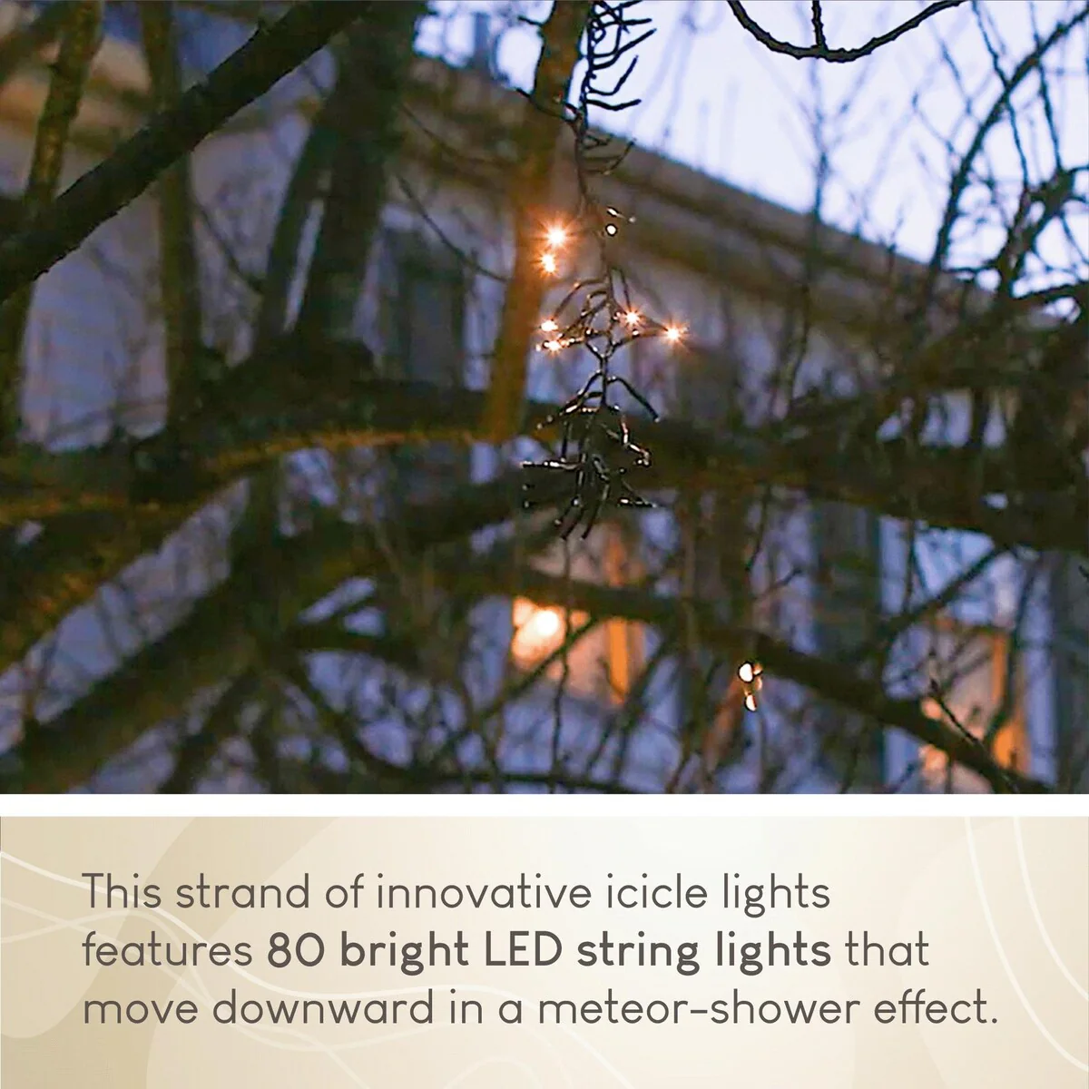Try something different with your Christmas lights this year! This strand of innovative icicle lights features 80 bright LED string lights that move downward in a meteor-shower effect. Each light string is battery powered and operated with an automatic timer, so there's no need to worry about going outside to shut off your lights. Sprinkle your front porch, trees, shrubs, or picture window with dynamic battery-powered string lights that will last a long time, thanks to the energy-saving LED lights. Lighticicles are perfect for decorating an evening party or holiday display. Plus, they're something just a little different from what all your neighbors have. Get a gorgeous, moving, sparkling light display without the hassle of weaving tangled strands through branches or finding an extralong extension cord. Each weatherproof icicle comes ready to hang and requires only batteries and a place to hang them. Lighticicles are easy to put up and fun to decorate with, and they'll look amazing anywhere you place them!WATERPROOF LED STRING LIGHTS: Cordless, battery-operated lights look great on your porch or trees.TWINKLE STRING LIGHTS WITH A TWIST: Each length of fairy lights sparkles in a downward pattern.SHINE IN ALL SEASONS: Rain and snow won't stop these outdoor icicle tree lights from sparkling.AUTOMATIC-TIMER OUTSIDE LIGHTS: With these outdoor string lights, you can set it and forget it.UNIQUE CHRISTMAS DECORATIONS: The pretty icicle design makes your holiday decorations stand out.