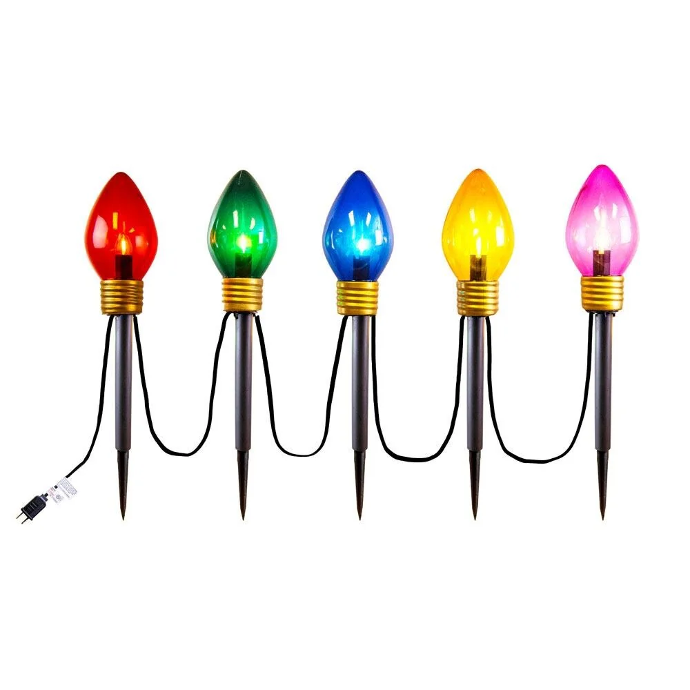 Our Jumbo C7 Multi Color Light set is perfect for giving any sidewalk or driveway a classic appeal during the holiday season. These jumbo light sets are made with an LED C7 candelabra base bulb inside of the oversized retro fit bulb cover made to resemble your favorite old fashioned Christmas light bulbs. Each Jumbo set comes with 5 multi colored covers with each being 8” tall by 4” wide and spaced 12” apart for a total length of 6’. Five 11” light stakes are included with each set for securing firming into the ground. Each set is connectable end to end and made for indoor and outdoor use. UL listed.Jumbo LED C7 Multi Color Pathway Light Set5 Multi Color Jumbo C7 Plastic (Shatterproof) GlobesIncluded Colors: Red, Green, Blue, Yellow, Pink0.6W LED C7 Warm White Filament Bulbs (Included) - 2 Spare Bulbs11" Ground StakesBlack C7 String Connectable up to 15 SetsString Length: 6ftLead and Tail Length: 21" Lead and 3" TailWire Color: Black12" Spacing between and C7 GlobeNon-DimmableUL Listed for Indoor or Outdoor Use