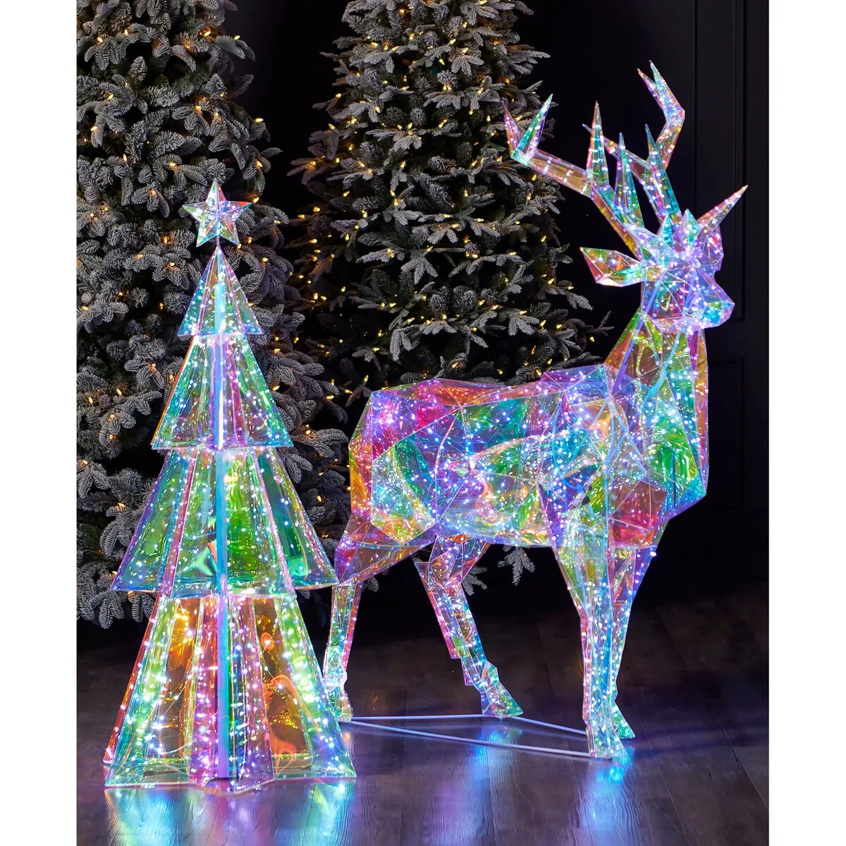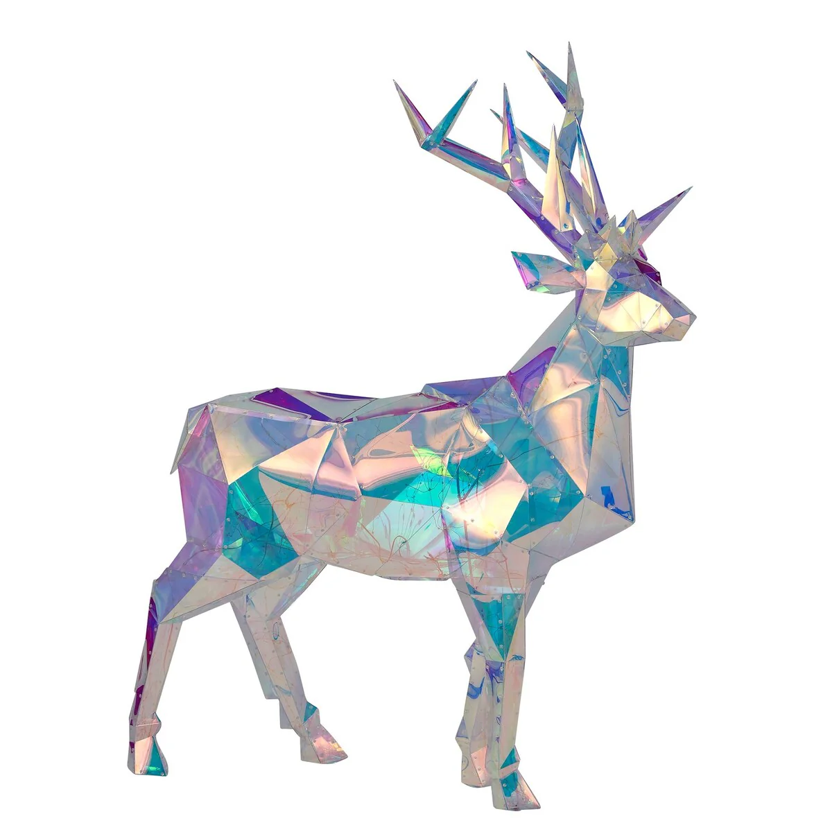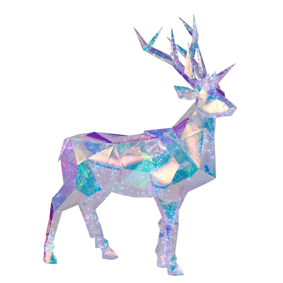 Transform your holiday display with our Prismatic Iridescent Christmas Deer crafted by Seasonal LLC. Standing at 57 inches tall and adorned with 610 LED lights, this majestic deer casts a mesmerizing glow whether placed indoors or outdoors. Add a touch of enchantment to your festive decor with this stunning centerpiece, meticulously designed to captivate and delight throughout the holiday season.