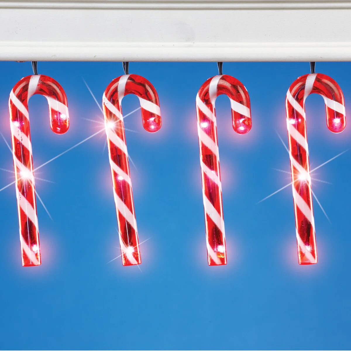 This solar light string of 12 bright red and white candy canes will make a sweet addition to your outdoor decorating. The versatile design can wrap around bushes, trees, or hang from a porch railing. Includes 1 "AA" rechargeable battery. Plastic. Total string length is 101"L and each candy cane is 6"H.