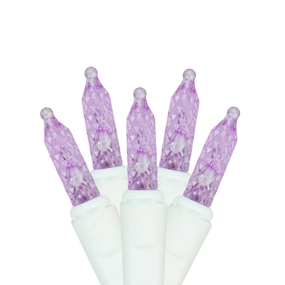 Product Features: Color: purple bulbs / white wire Number of bulbs on string: 70 Bulb size: M5 (mini) Approximate drop lengths alternate between: 9 inches 12 inches 5 inches and 16 inches long Spacing between each bulb: 4 inches Spacing between each drop: 7 inches Approximate lighted length: 9.5 feet long Approximate total length: 12 feet long Additional product features: LED lights use 90% less energy Lights are equipped with Lamp Lock feature which makes them replaceable interchangeable and keeps them from falling out Strand contains 2 rectifiers this eliminates the shimmer and shake in the light set Super bright bulbs If one bulb burns out the rest will stay lit Durable non-glass faceted replaceable bulbs Cool to the touch End-to-end connectors allow you to connect multiple sets together (not to exceed 210 watts) Wire gauge: 22 Comes with replacement bulbs and fuse UL listed for indoor/outdoor use 120 volts 60 hertz 0.05 amps 6 watts