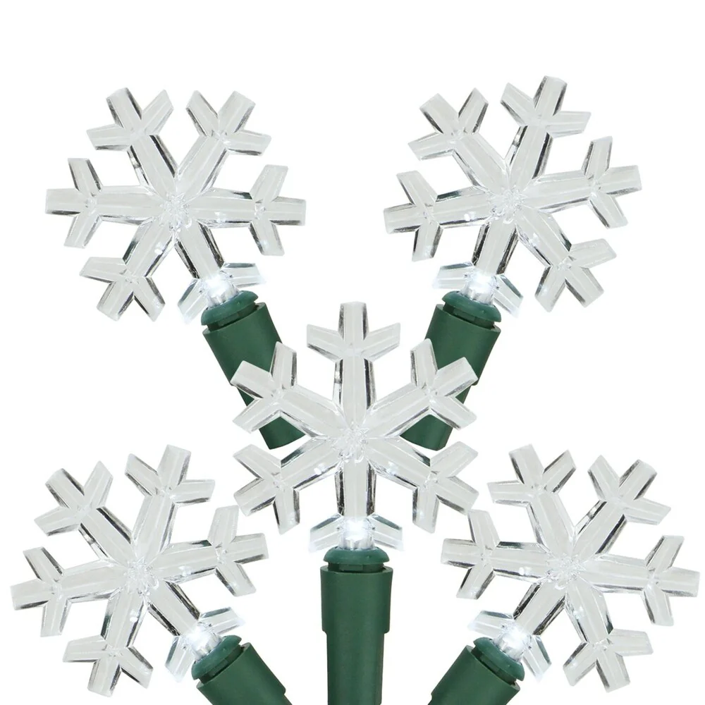 Set of 20 Pure White LED Snowflake Christmas Lights 4" Spacing - Green Wire