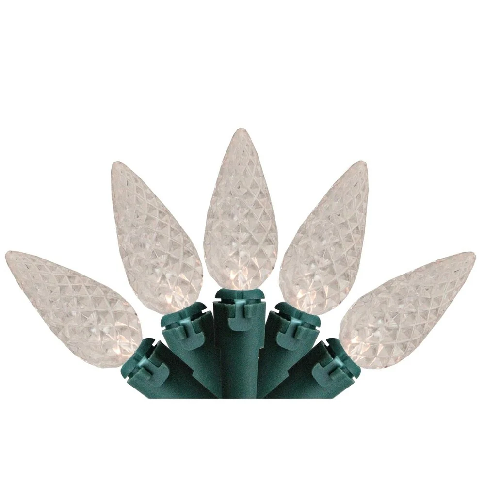 Set of 100 Faceted Pure White LED C6 Christmas Lights - Green Wire