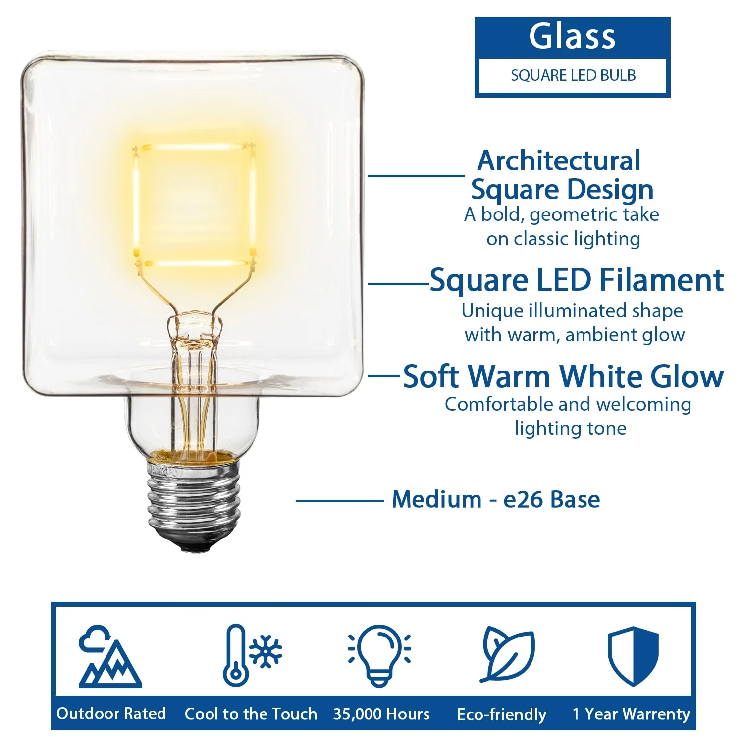 Experience the magic of our indoor/outdoor LED cube light bulb, as it immerses you in an enchanting glow, perfect for gatherings, parties, or everyday use. These Edison-style bulbs for outdoor string lights and pendants transform any space into a warm, inviting haven, making every moment under their glow a memorable one.Crafted from a coated glass housing, these outdoor light bulbs for desk lamps and light strings offer long-lasting illumination for various occasions. Each LED light bulb boasts a robust build that withstands different weather conditions, making them a reliable outdoor choice.Showcasing versatility, these E26 LED bulbs can be easily screwed into our stringers and desk bases for both indoor and outdoor use. Whether it's a cozy evening in the living room or a barbecue on the patio, the LED Edison bulb fits seamlessly into any setting.Measuring just under 4 inches deep, wide, and tall, these replacement bulbs for outdoor string lights provide a potent yet energy-efficient light source. The bold size and shape of the LED Square-Filament Lights makes a statement and delivers ample brightness without excessive energy consumption.Trust in Festive Living products for superior customer service and top-quality Edison light bulb, fairy lights, and more at affordable prices. With Festive Living you're investing in outdoor light bulbs that perfectly blend quality, durability, and affordability.