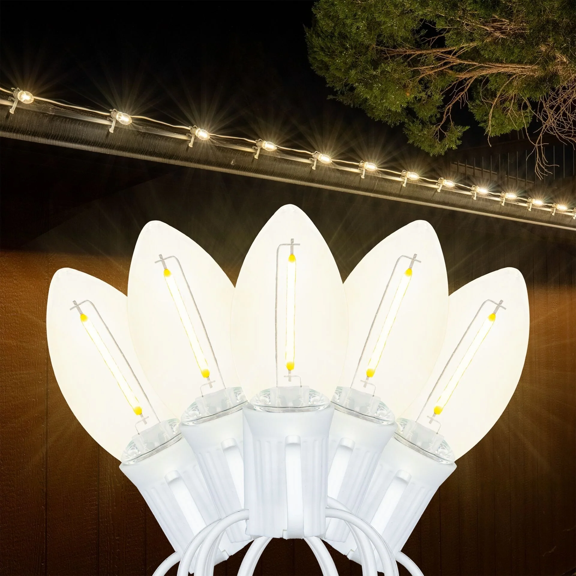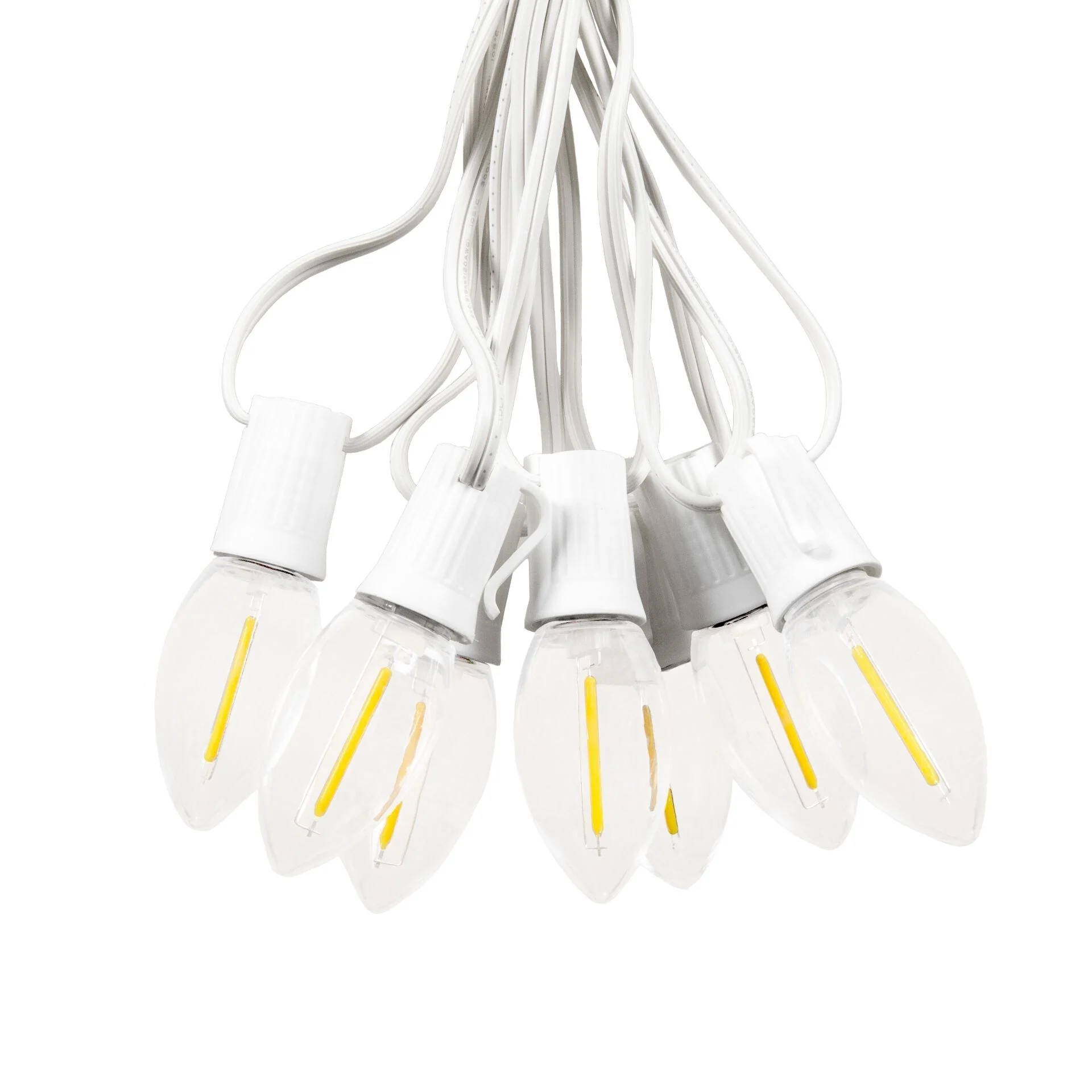 Illuminate your festive celebrations with our string lights 25 ft that cast a magical glow. These 25 Lamp C9 transparent Plastic Filament LED String Lights Sets are designed with a green wire, perfect for both indoor and outdoor spaces. Adding a touch of enchantment to your holiday season, these outdoor string lights led offer aesthetic appeal and versatility, making them a holiday essential for every home. Our string light wire allows you to cover larger areas with ease. The 25' long string lights feature a 12" bulb spacing, ideal for decorating expansive trees and rooflines. These bulb string lights can connect up to 43 sets end-to-end, offering a seamless and professional finish. Being UL Listed for both indoor and outdoor use, these lights are not only versatile but also safe.Experience the durability and longevity of our 'c9 green Christmas lights'. These commercial-grade lights with non-removable bulbs provide a steady and consistent light source, eliminating any flickering. Enhancing the overall visual appeal of your 'Christmas house light', this feature makes your decorations truly shine.Save on your energy bills with our outdoor lighting products. These energy-efficient string lights use only 4.8 Watts per string, making them not only environmentally friendly but also cost-effective. Our 'Christmas light cable' comes with a built-in rectifier, eliminating the need for a special adapter and adding to the convenience of using these lights.Set up your 'Christmas tree light' effortlessly with our general mounting tips. For outdoor patios, we suggest using 'aircraft wire' as a support cable for a clean, professional look. When using our 'string lights 25 ft' for rooflines, mount along the roofline following our all in all clips to mount under shingles or on gutters, ensuring a straight, secure line along your home.