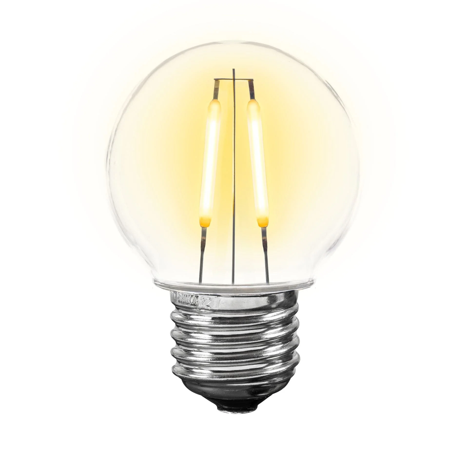 Introducing the new LED Dual Filament Filament G50 Globe Bulb with an E26 medium base. This energy-efficient bulb delivers bright, uniform lighting with a sleek, modern design, perfect for decorative and accent lighting in any space. Featuring a single filament for a vintage-inspired look, it offers long-lasting performance while consuming minimal energy. This versatile LED bulb provides a warm, inviting glow that is sure to enhance any environment. No need to change your medium base patio string to take advtage of the elegant globe bulb look offering a stylish, contemporary touch.