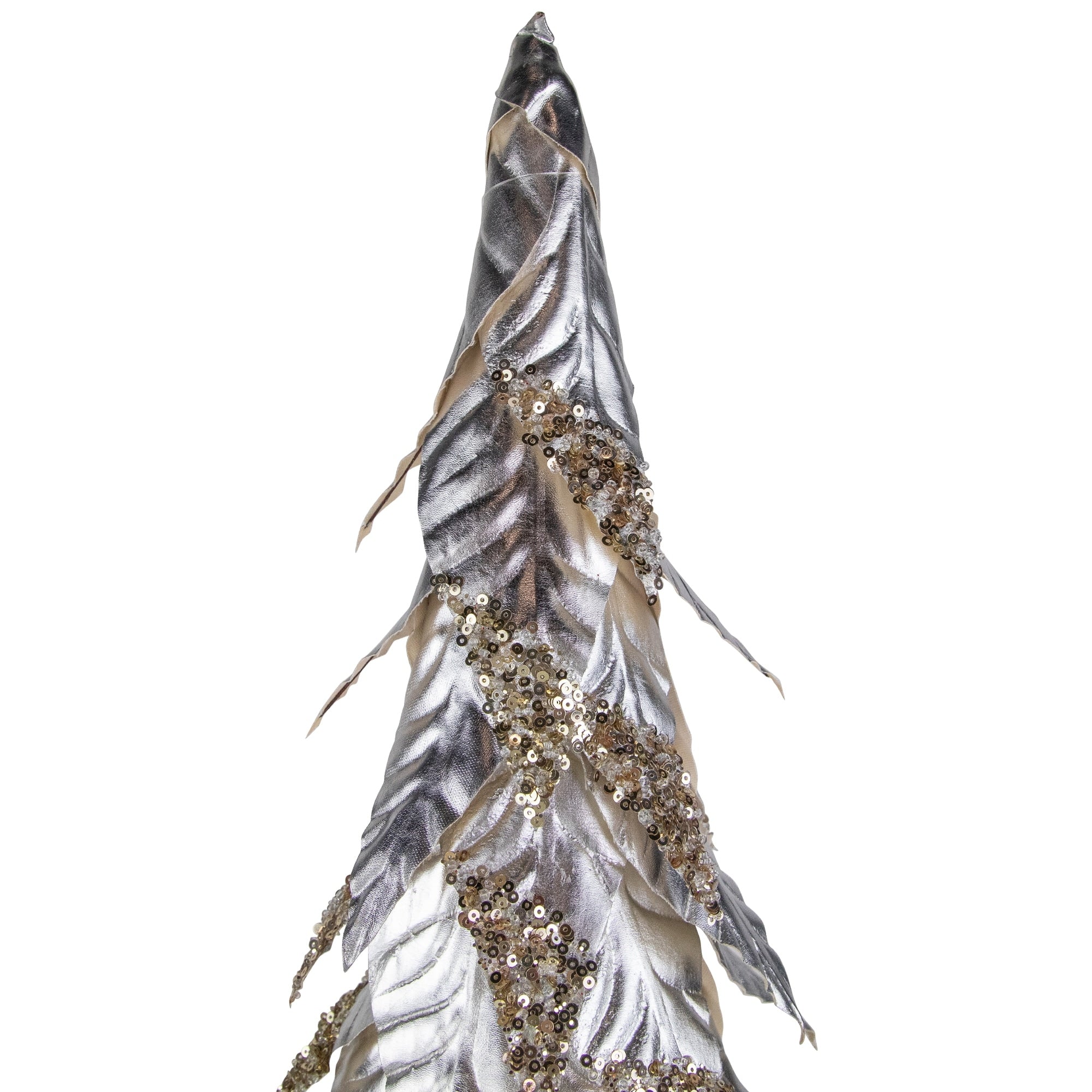Add some glamour and shine to your holiday decor with this platinum leaves layered Christmas cone tree. This exquisite piece features layers of silver leaves embellished with champagne and clear sequins, creating a dazzling and eye-catching effect. The tree is beautifully crafted and stands at 26 inches tall, making it the perfect size for a table-top or floor display. The sparkling sequins catch the light beautifully, creating a magical ambiance in any room. Bring the spirit of the season to your home with this stunning Christmas tree that is sure to impress all of your guests.