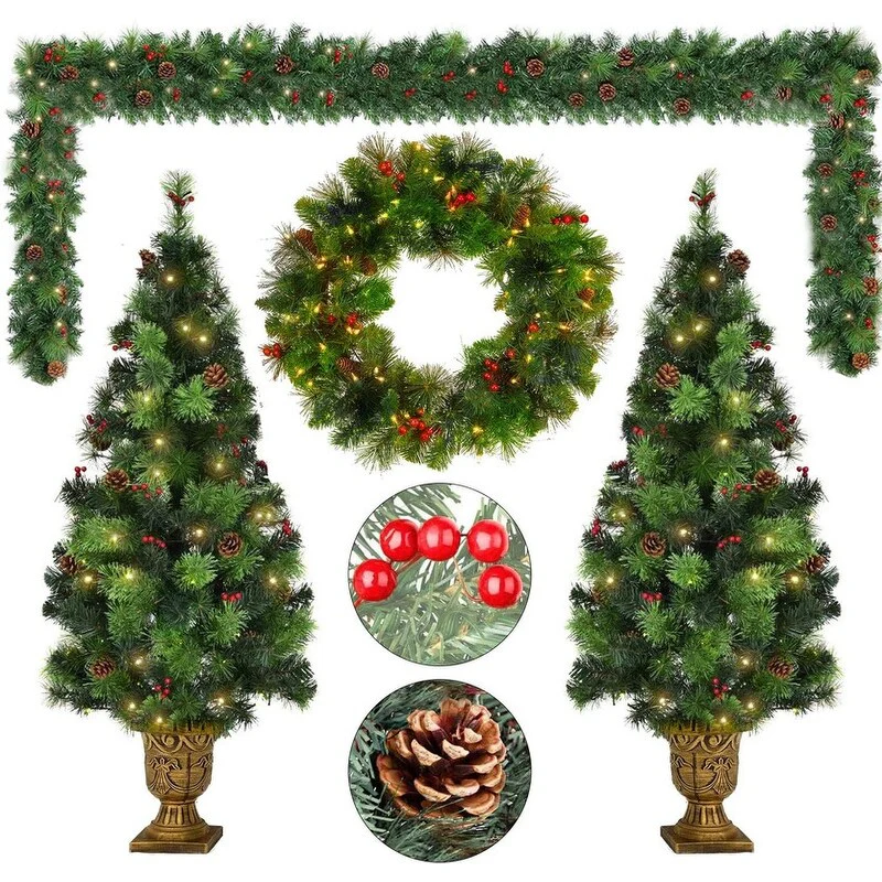 - 180 50 built-in UL-rated warm LED lights for perfect holiday ambiance(30 lights for wreath, 50 lights for garland and each entrance tree)