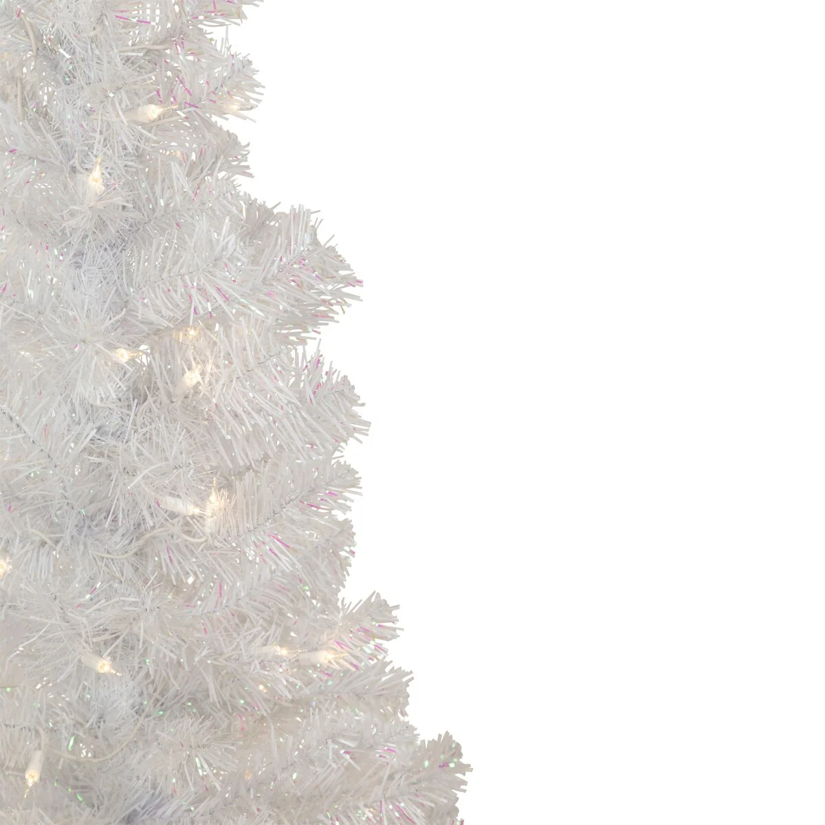 With its immaculate color and generous profile the Rockport White Pine Christmas tree glistens with wintry beauty. It is a designer-inspired alternative to a traditional green tree with its dazzling white pine needles. The branches contain a mix of matte white and clear iridescent needles that create texture and add depth to the tree. The iridescent needles beautifully reflect the soft glow from the blue incandescent mini lights. This tree is perfect for a quick and easy setup and ideal for corners or tabletops.
