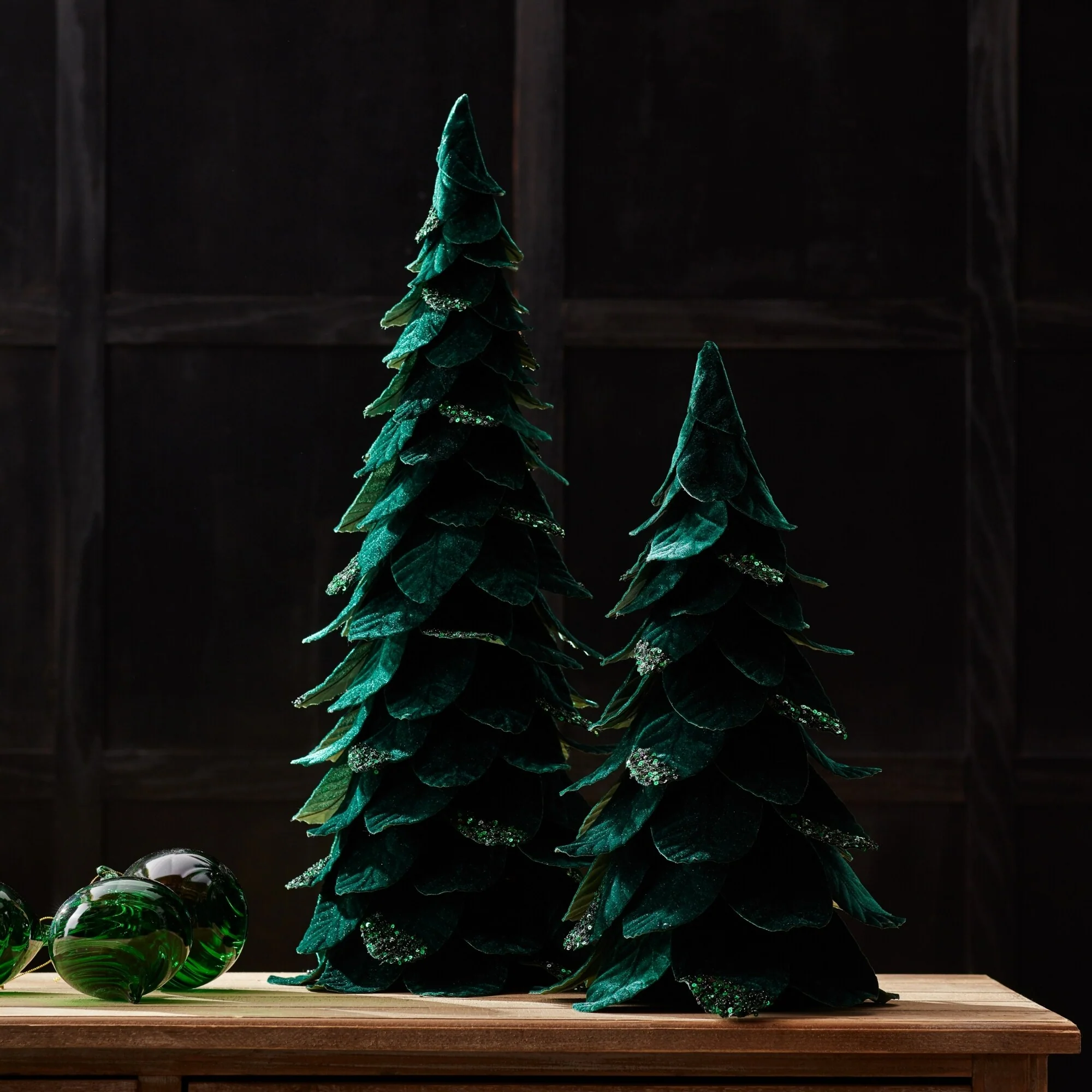 Enhance your holiday décor with this stunning set of beaded leaf pine trees. This set is a perfect fit for both traditional and modern styles. The festive green tones, chic beaded accents, and faux velvet leaves create a memorable display. These pieces are designed to endure for seasons to come. Display them on your mantle or bookshelf, or gift them to spread holiday cheer.