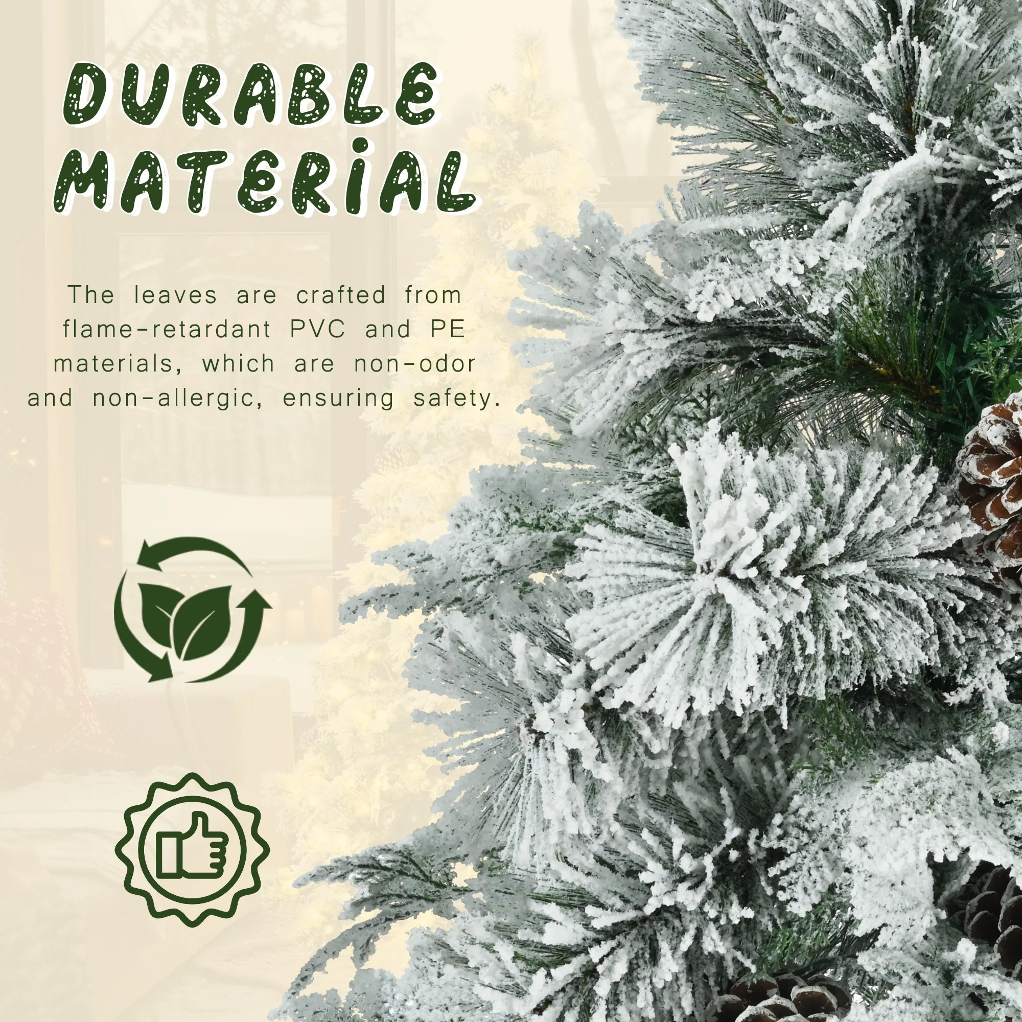 - Our Christmas trees are made of high quality PVC and PE materials, the leaves are soft to touch and lifelike. These materials are free of harmful substances, non-toxic and harmless, safe to use. Moreover, these artificial leaves are very durable and can accompany you through many holiday seasons, so that your home is always full of festive atmosphere.