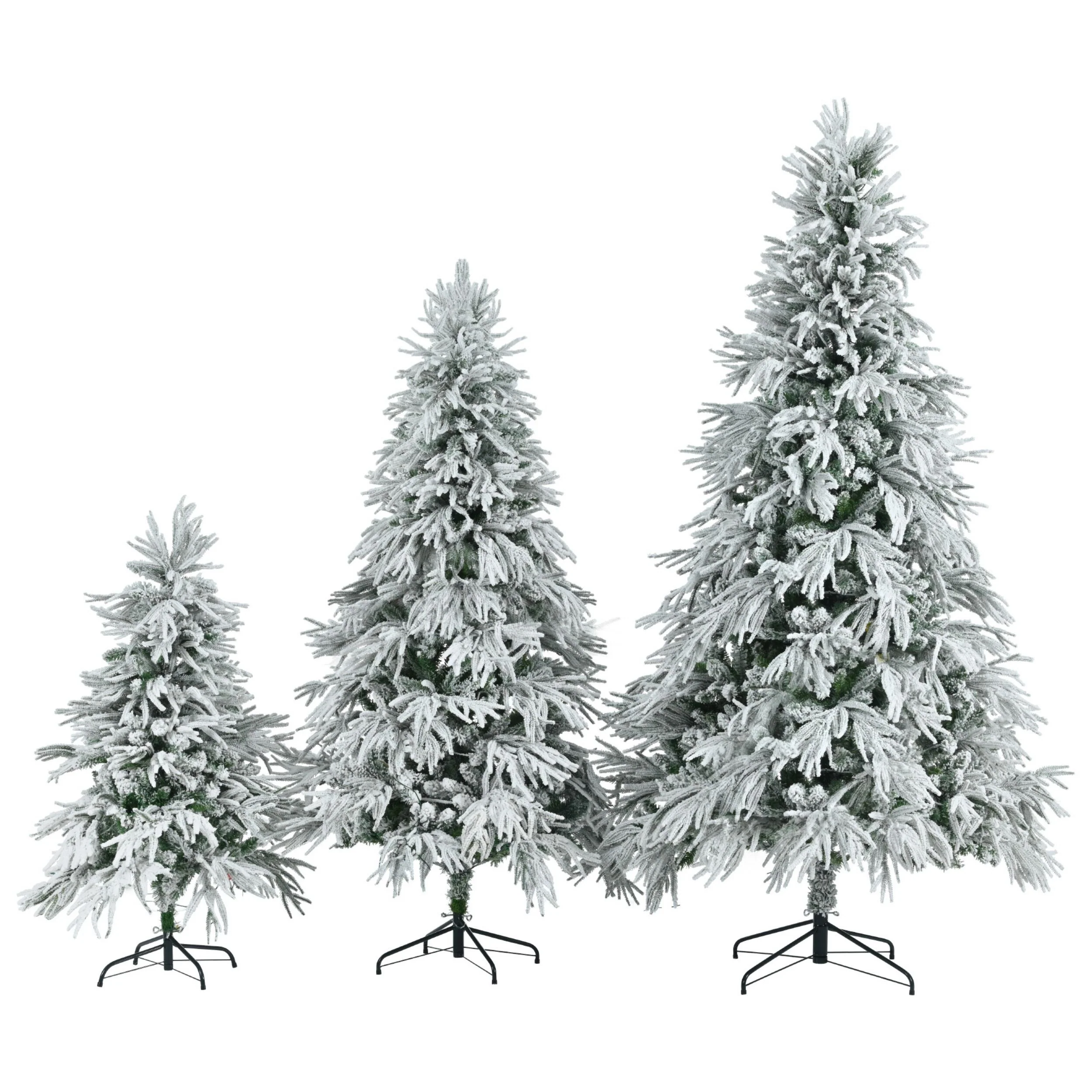 - Set includes three beautiful snowflake Christmas trees gorgeously decorated in different sizes: a 4 ft. This Christmas tree set includes three 4 ft. tall, 6 ft. tall and 7.5 ft. tall Christmas trees. Each tree is decorated with beautiful pine cones and the number of branch tips increases with the height of the tree. The number of LED lights on the branches also increases with size. These colored lights will add a bright and warm holiday atmosphere to your home.
