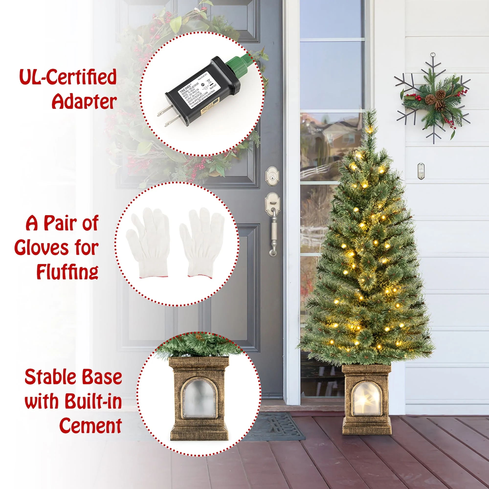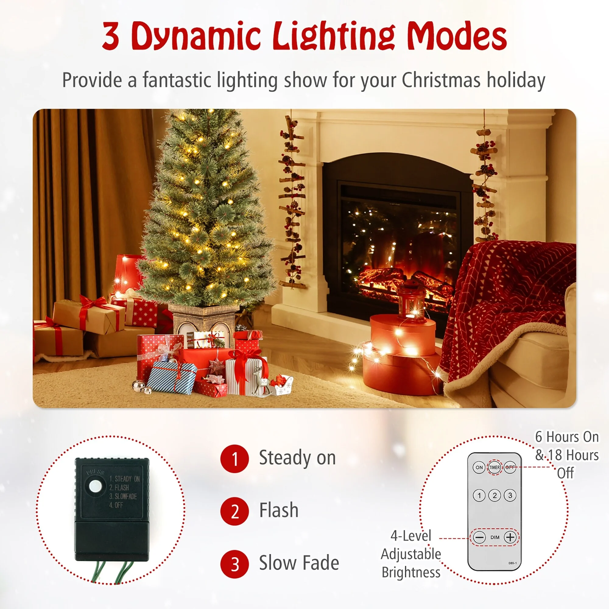 Create a Stunning Holiday Ambiance for Your Christmas!This 4 ft pre-lit potted artificial Christmas tree features flowering pine needles, adorned with warm-white LED lights, infusing warmth and magic into your space. Its retro urn base adds a touch of elegance to your festive display. Moreover, with 3 lighting modes, you can easily create the perfect ambiance for your Christmas celebrations. And it includes a remote control and a controller for easily customizing the lighting effects to suit your preference. The brightness can also be adjusted. Besides, crafted from 100% new fire-resistant pine needles, this tree combines both safety and authenticity.