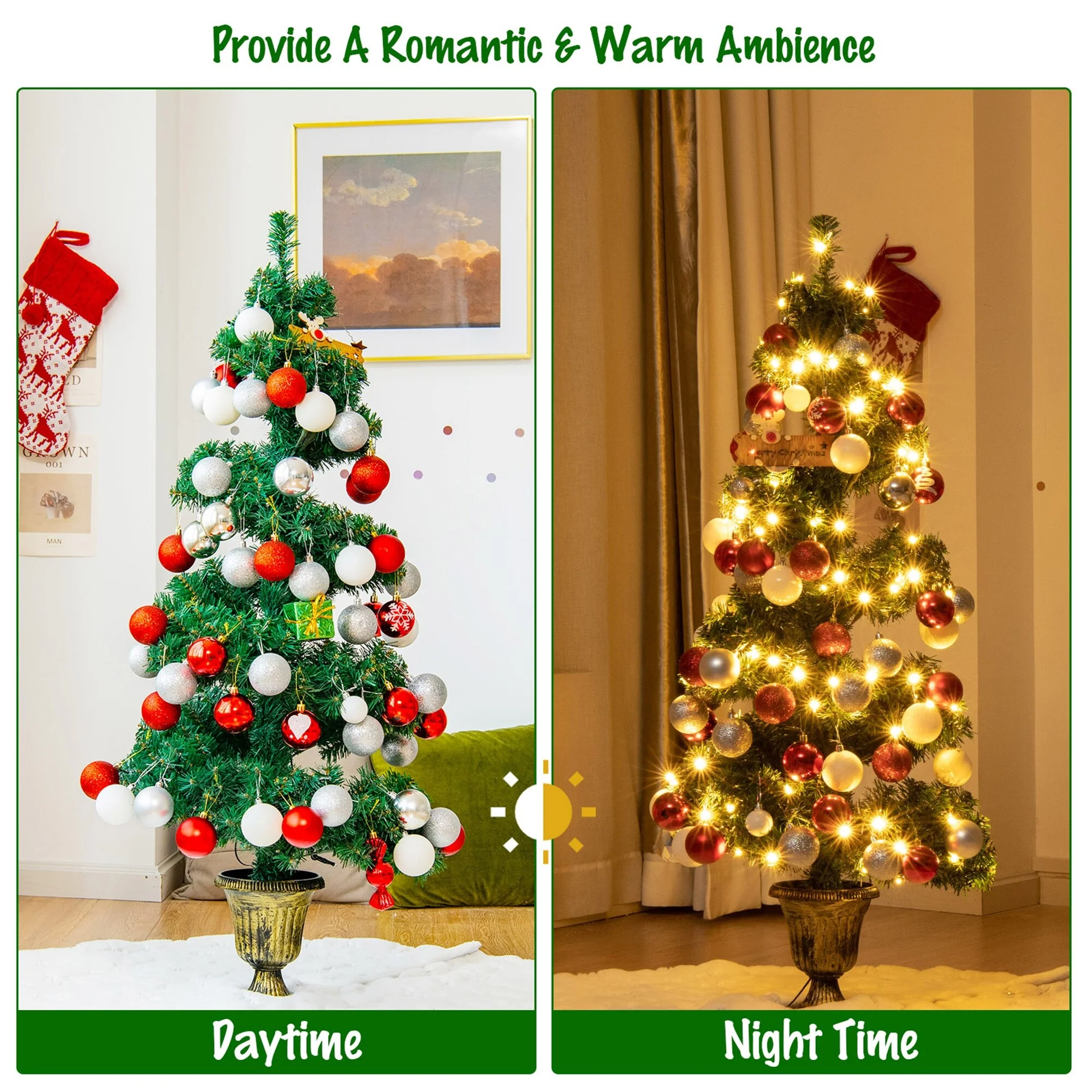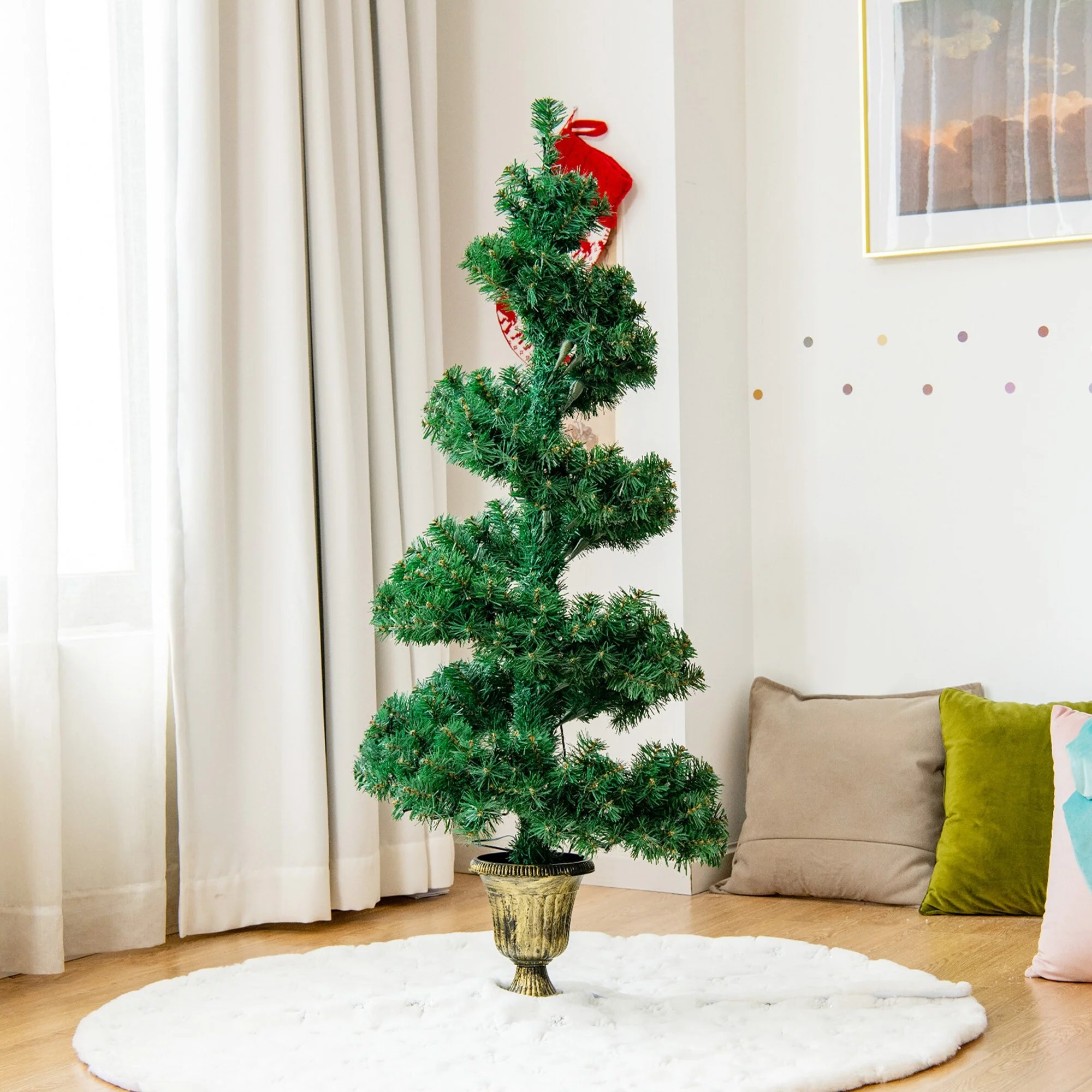 Bring home strong festival atmosphere with this spiral verdant artificial Christmas tree. Perfect for either home or commercial place, this Christmas tree spreads holiday joy and sincere wishes. It stands at 4 feet tall, with 364 branch tips, and composes lush appearance in helical tree shape, being an eye-catching decoration to let you feel the Christmas spirit that is wafting through the decorated places. More, premium PVC leaves can not only make the Christmas tree odor free, but also provide a safe using experience season after season. It also comes with a stable retro urn stand, so that the Christmas tree can stand straightly without toppling. This verdant spiral Christmas potting perfectly matches with entryway, mantel and gate.
