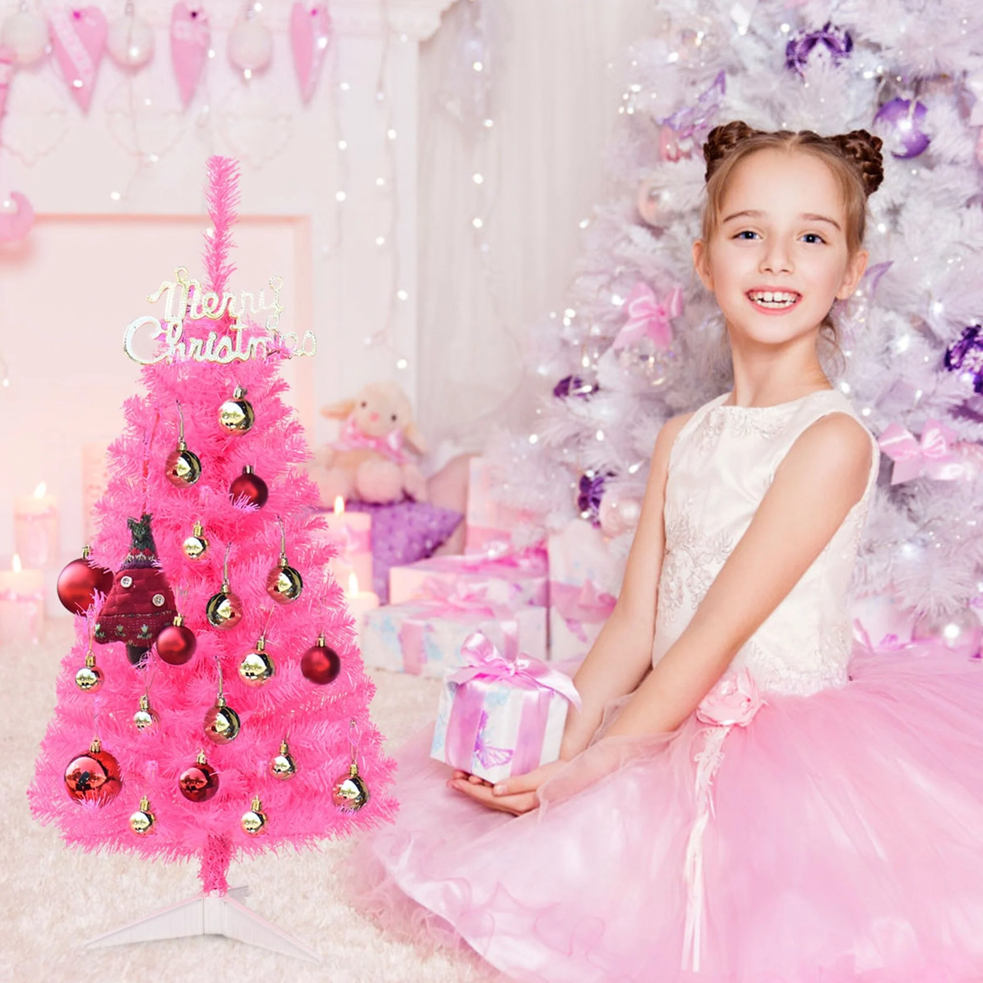 Are you tired with decorating your home with generic green and bloated Christmas tree and in search for some unique substitution for a new festival scene. This mini pink Christmas tree will never let you down, and brighten up your mind. It enjoys eye-catching pink color, 116 branch tips design to help emulate a real Christmas tree. The tree is made of fade and crush resistant 100% new PVC needles, appears fresh-cut. No odor, non flammable, non allergic, it provides better using experience for you in the Christmas season. Padded solid plastic base to keep the tree planted in an upright position. Bring this Christmas tree home to create your desired yet unique Christmas atmosphere.